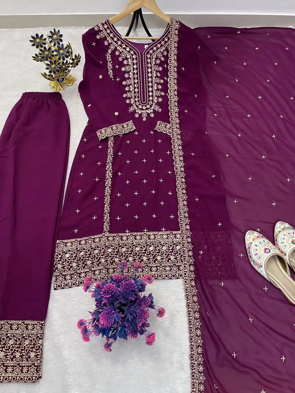 | Bottom: | HEAVY FAUX GEORGETTE WORK : EMBROIDERY SEQUENCE WORK PENT SIZE : FREE SIZE INNER : MICRO HEIGHT : 39”inch |
