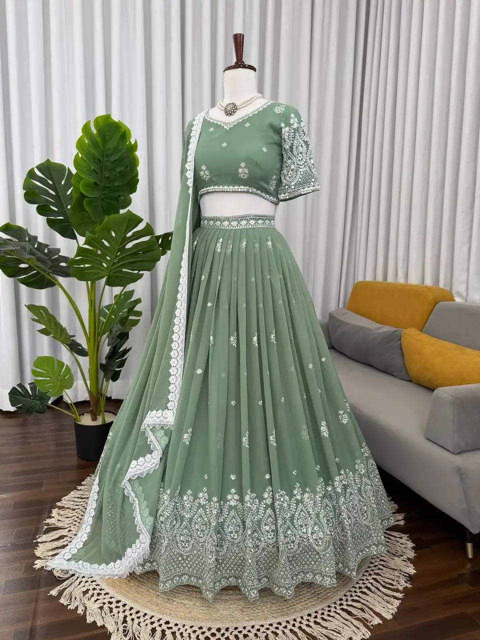 Lehenga : Foux Gorgette Work. : thread with 9mm Sequnce Stitching: Fully Stitched | Fits up to Size 44