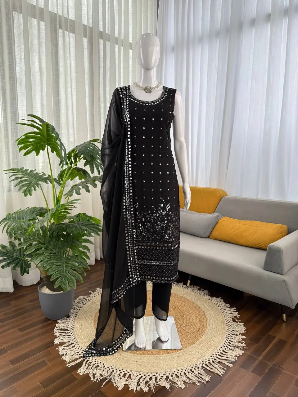 Top Foux Gorgette, Lining- Soft Micro Cotton, Work- Thread with Sequnce with Real mirror, Length-47inch, Front and back both side work, (3XL margin for a custom fit)
