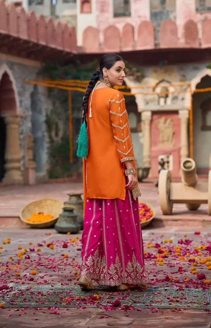| Top: | Chinon silk Lining: Soft Micro Cotton Work: Thread with Sequnce 3XL margin for a custom fit and extra sleeve inside attch Length: 40 inch |