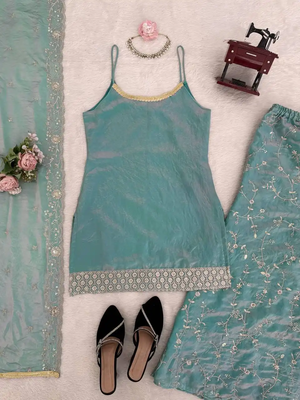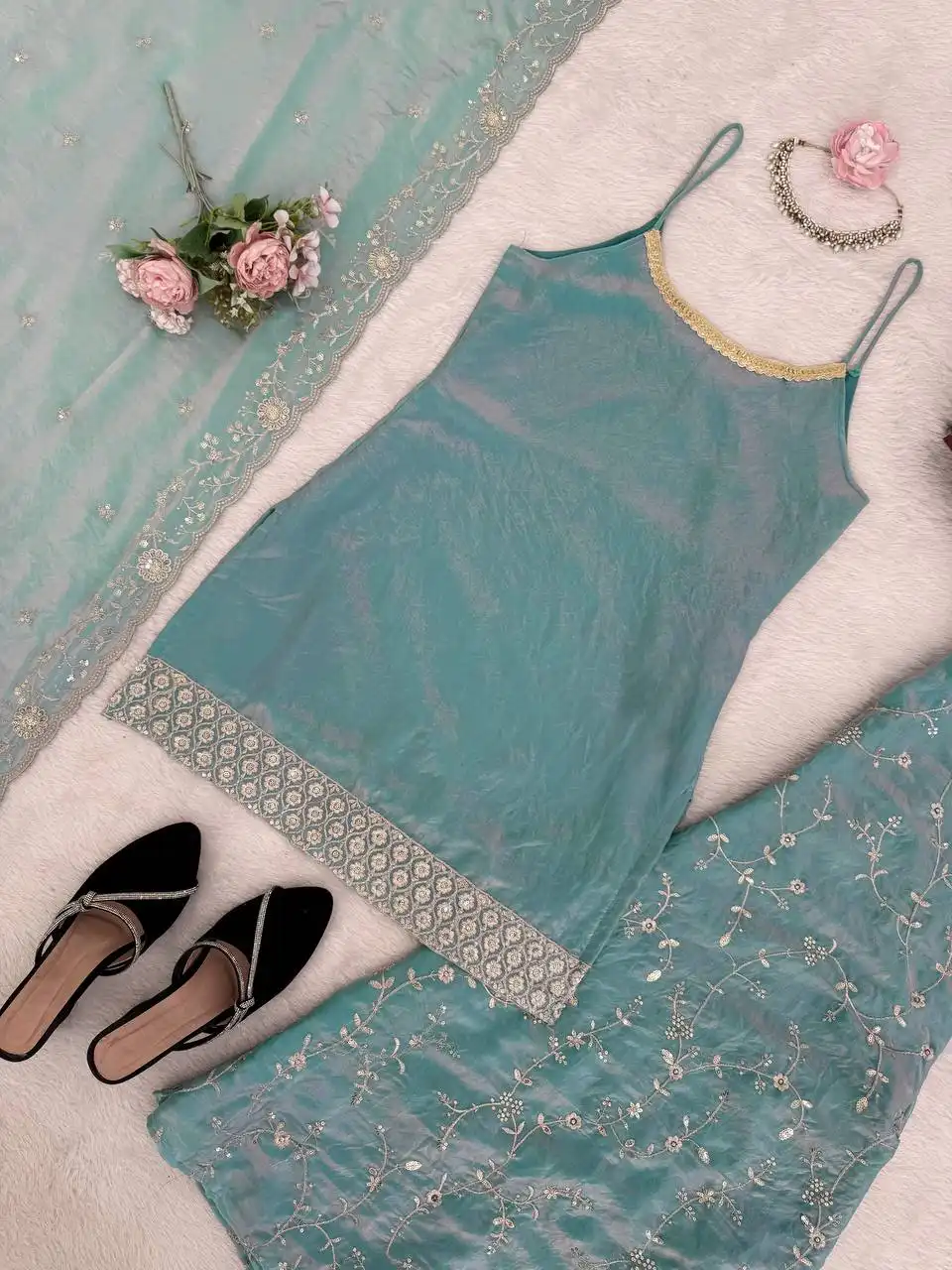 | Bottom: | Fendy silk Work: thread with Sequnce Fit: Fully Stitched up to Size 44 with Stretchable Elastic Waist Length: 38 inches |
