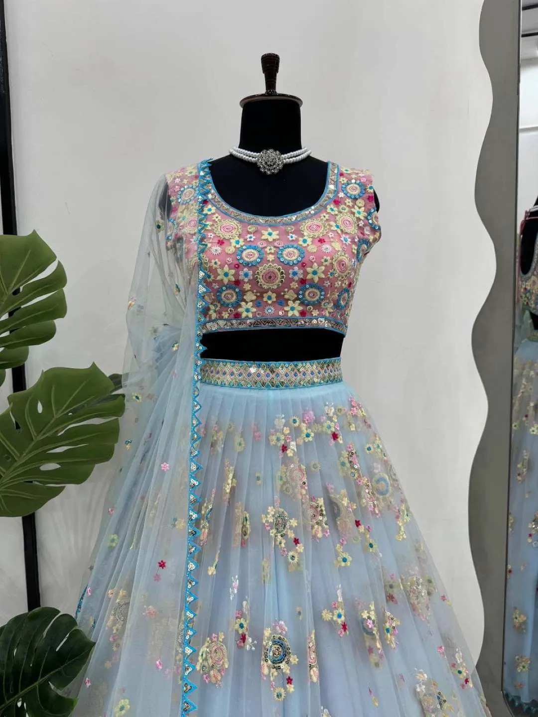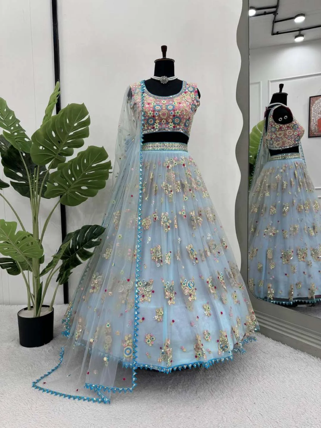 Lehenga: Butterfly net ,Thread with Sequence ,Up to 44 ,Semi-Stitch ,3.5 meter and cancan with canvas