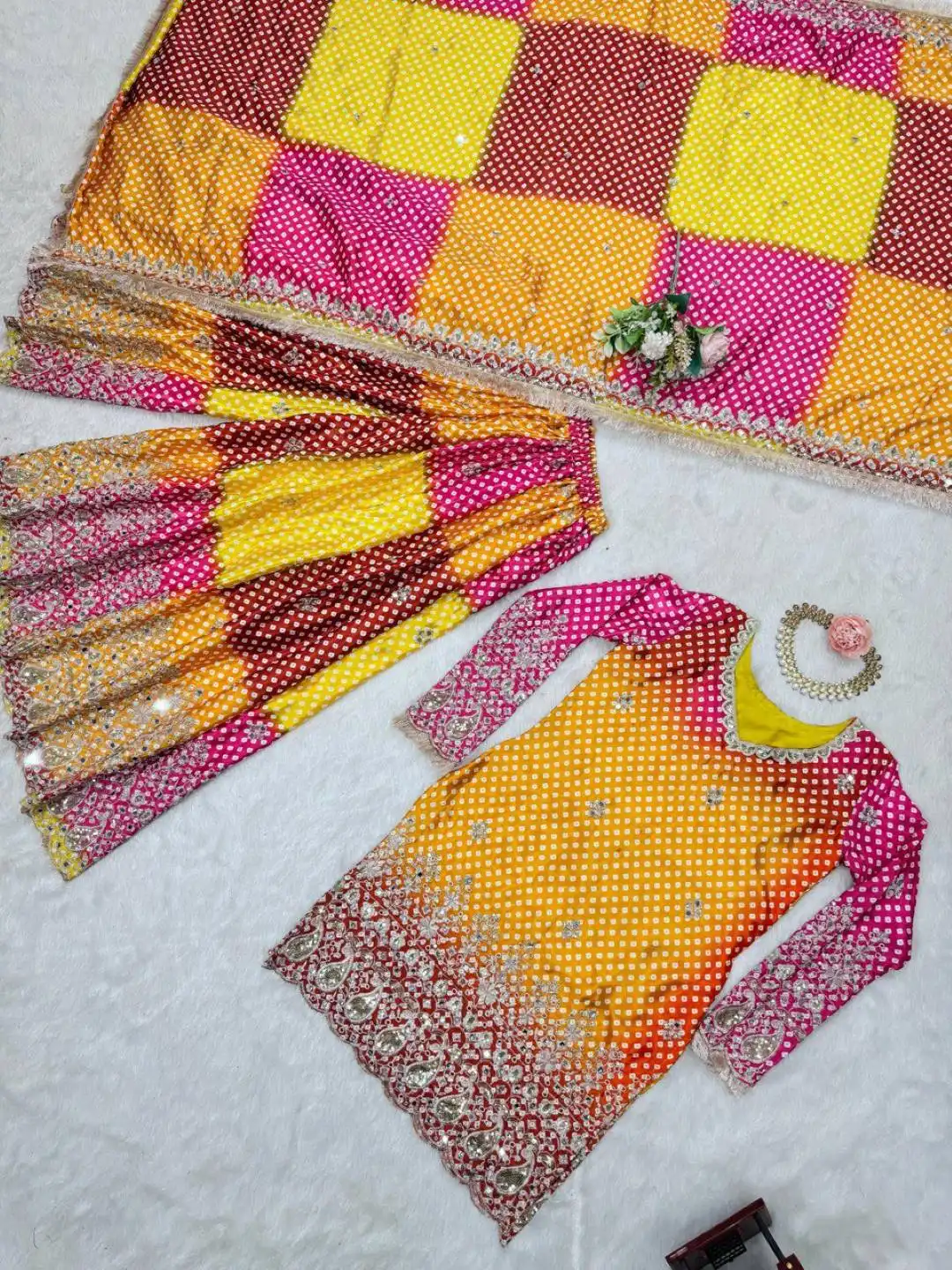 | Plazo: | Chinon silk Work :- Digital print with thread with Sequnce with *Real mirror work Stich :- Full stich upto 44 with elastic |