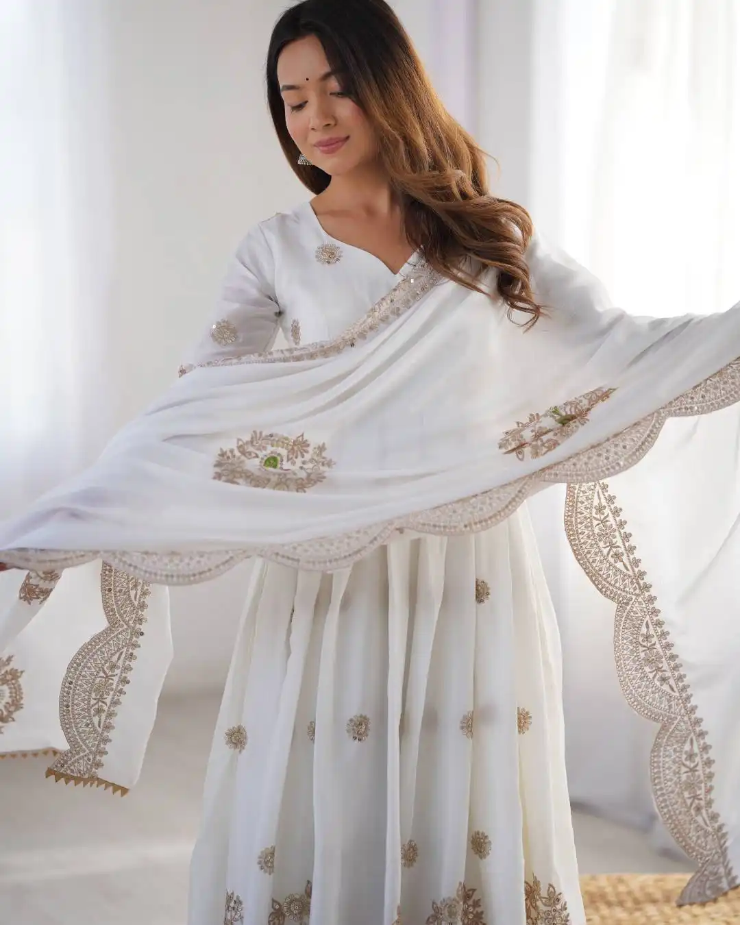 DKT 5100 Chinon Silk Embroidery Work Women White Gown Pant With Dupatta Set |