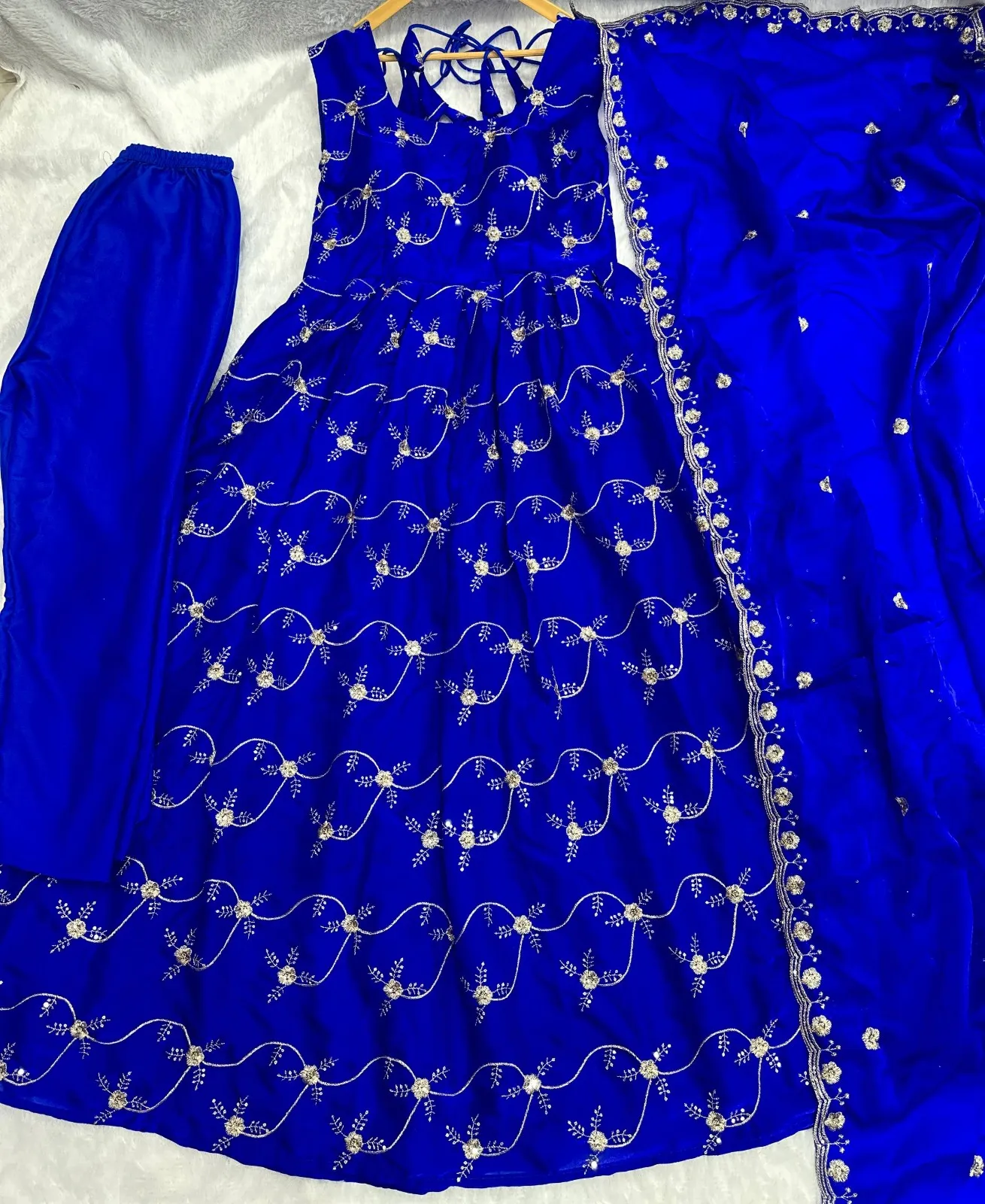 Top Fandy Silk, Innner- Crap, Work- Embroidery Sequence Work, Flair- 3.5 Meter, Chest Size- M(38),L(40),XL(42),2XL(44), length- 52”(Sleeves gives separate)