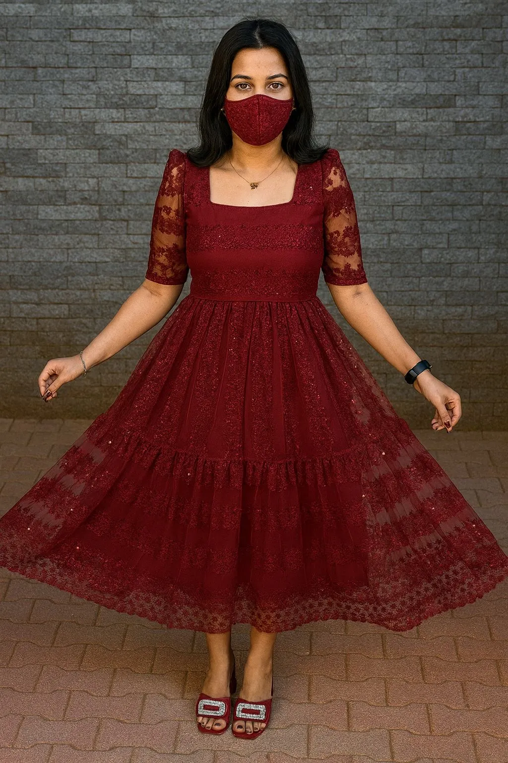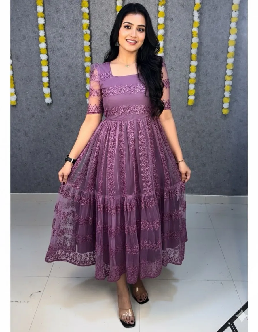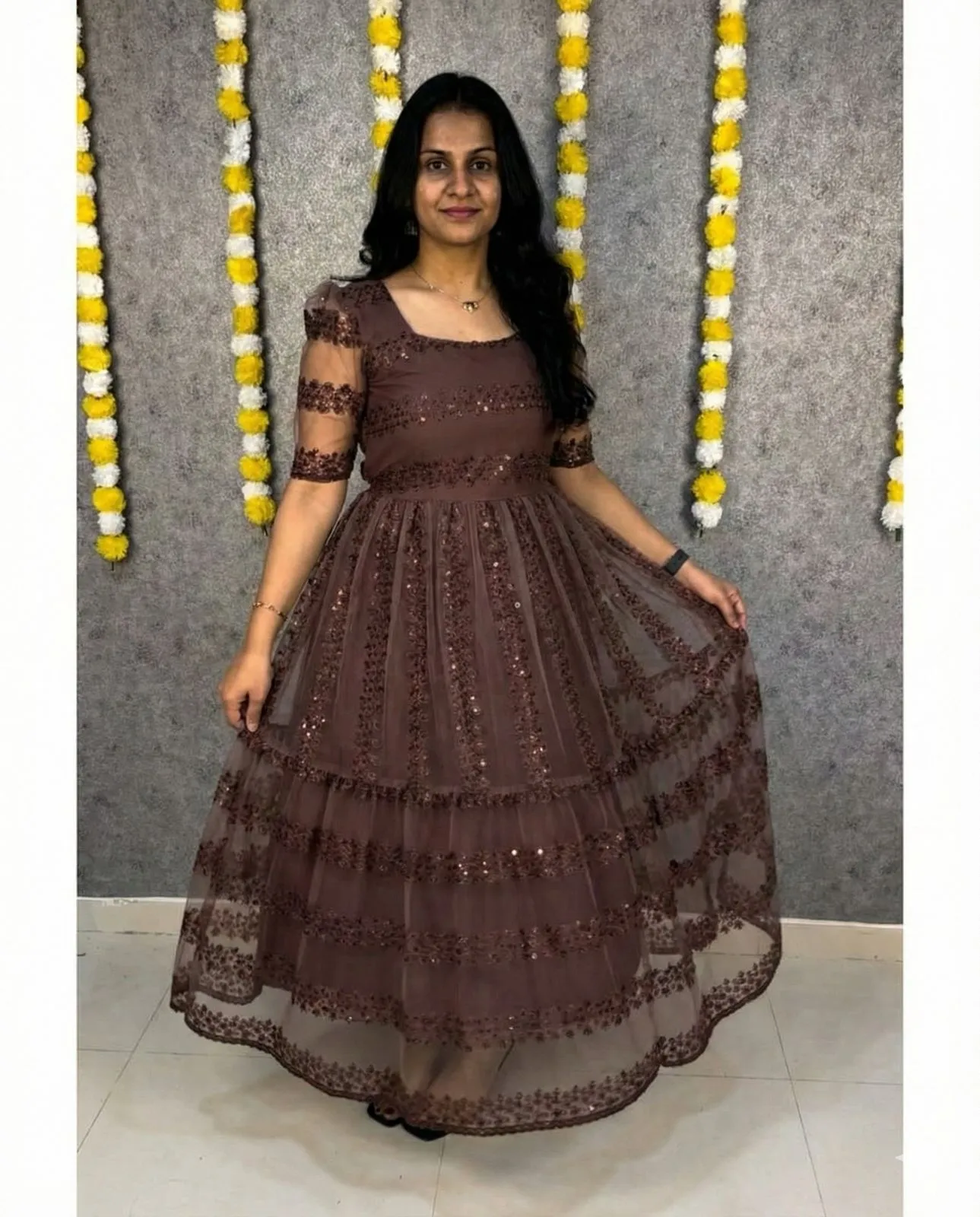 | Kurti | Heavy netwith with chiifli siqunce work, Heavy sequence + flower embroidery, Sleeves: PUFF SLEEVE 10-11 inches, Length: 46, Fit: Comfort fit with flowy silhouette |