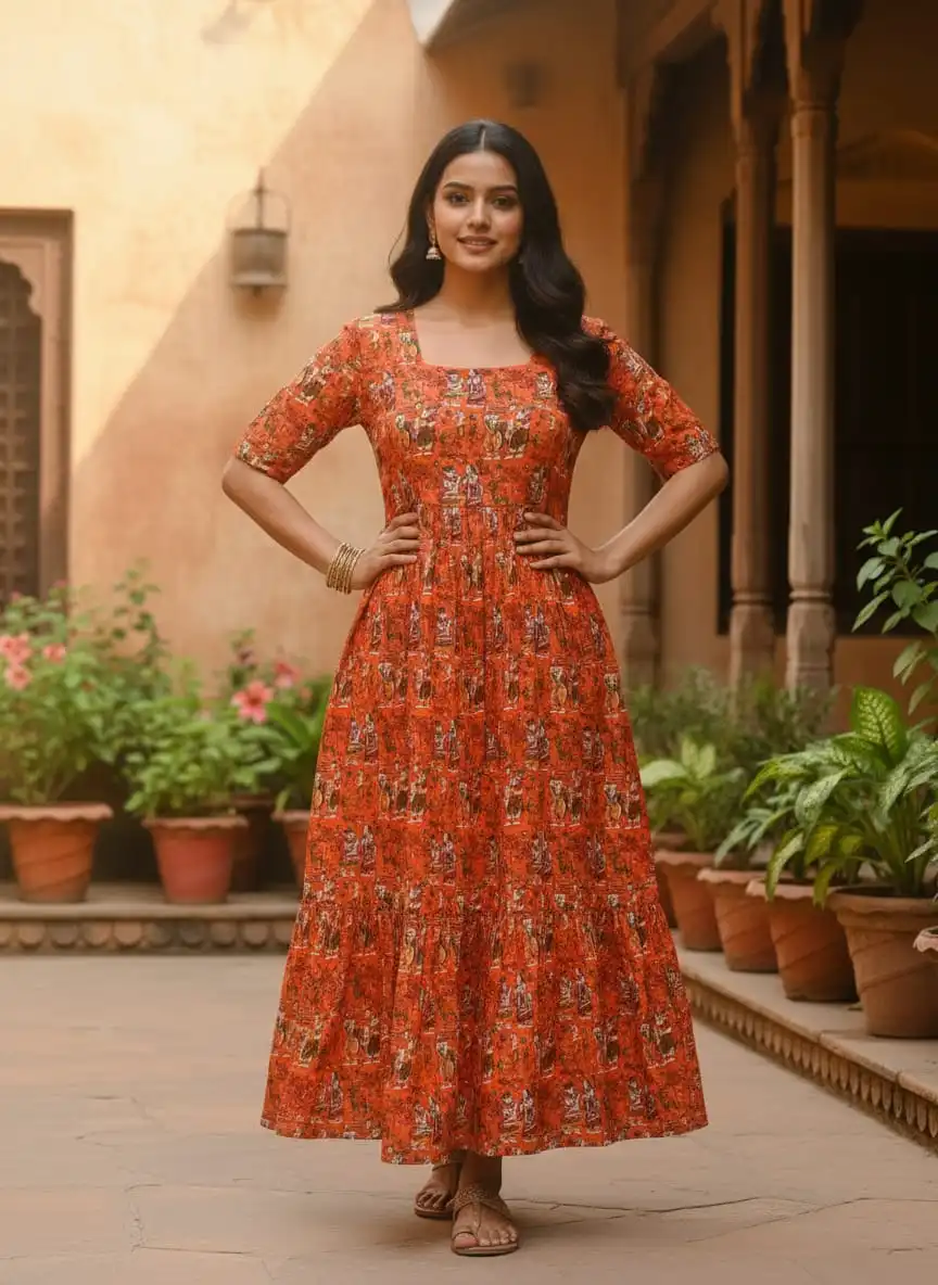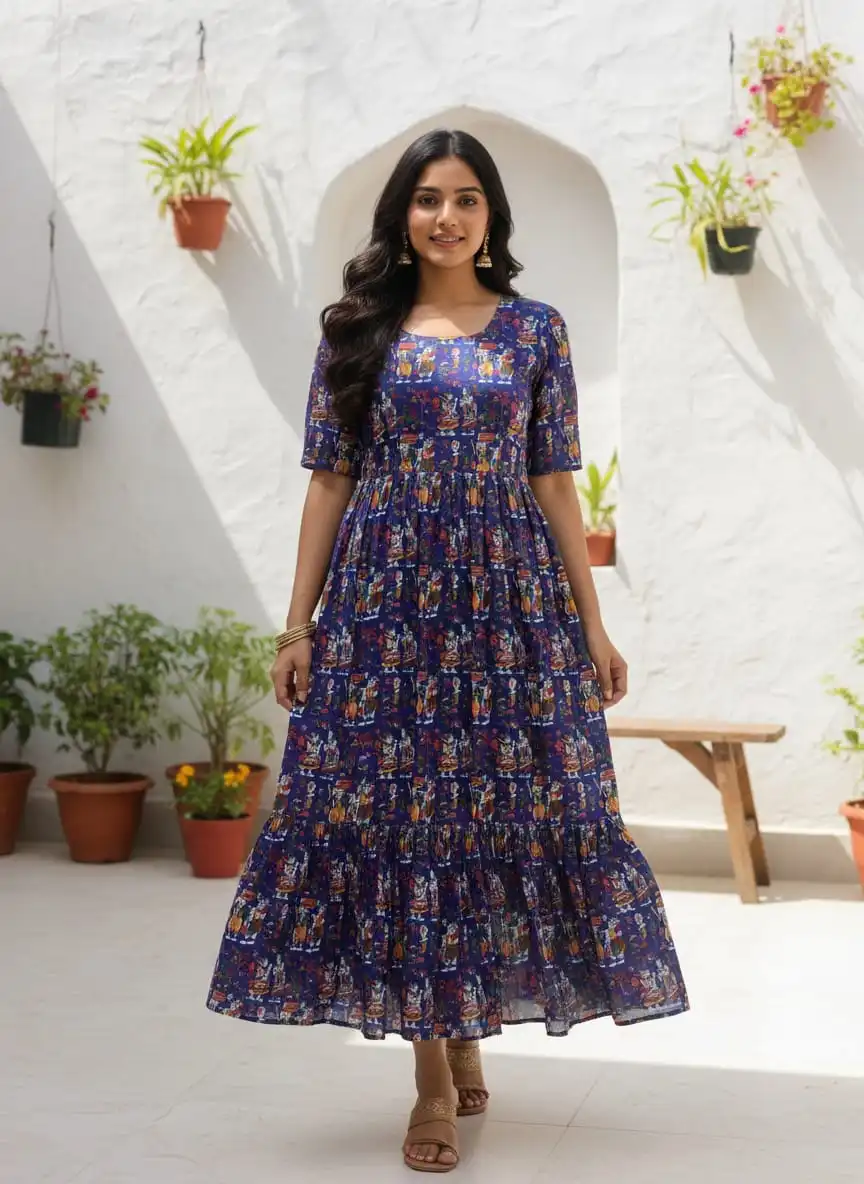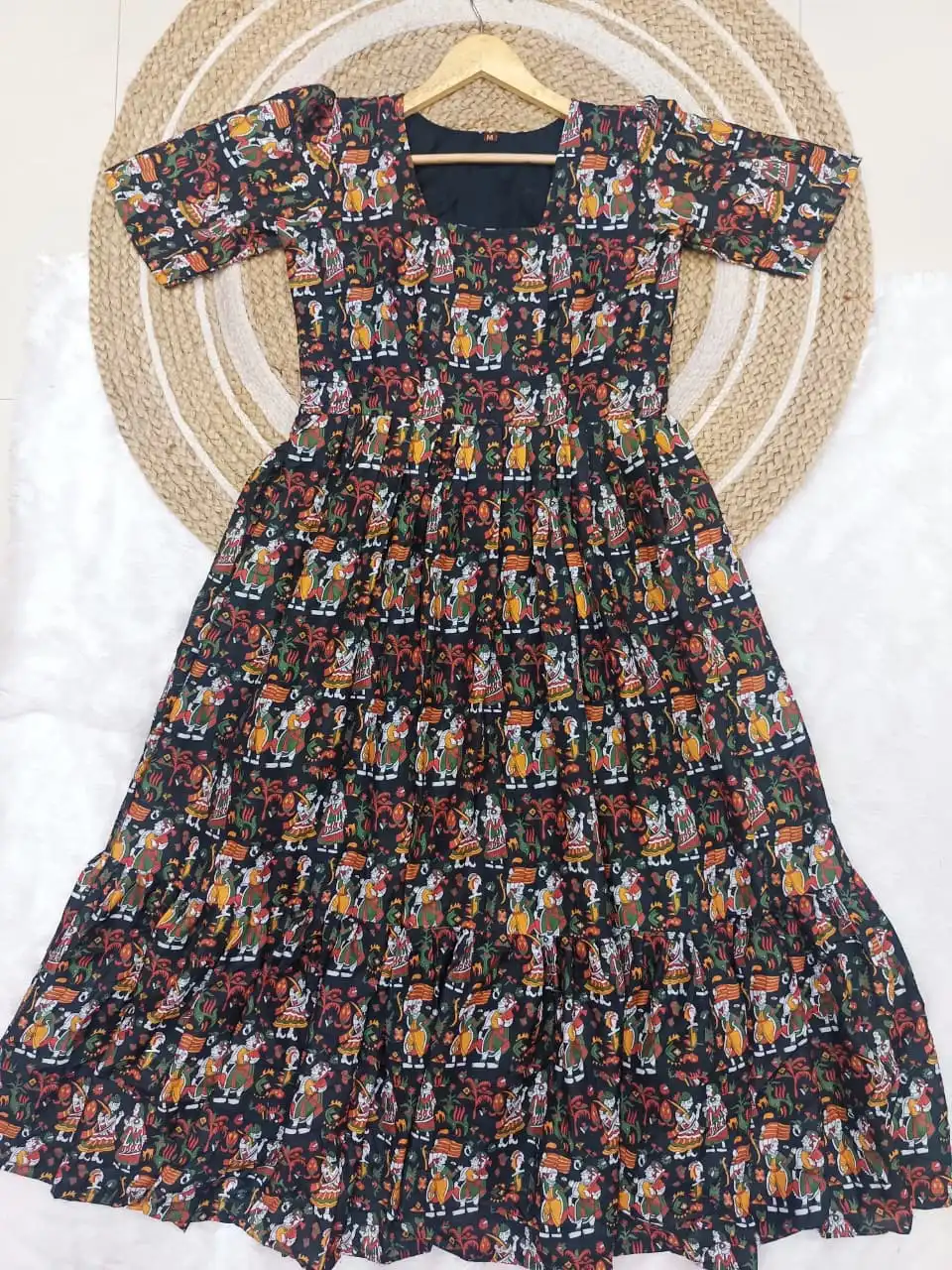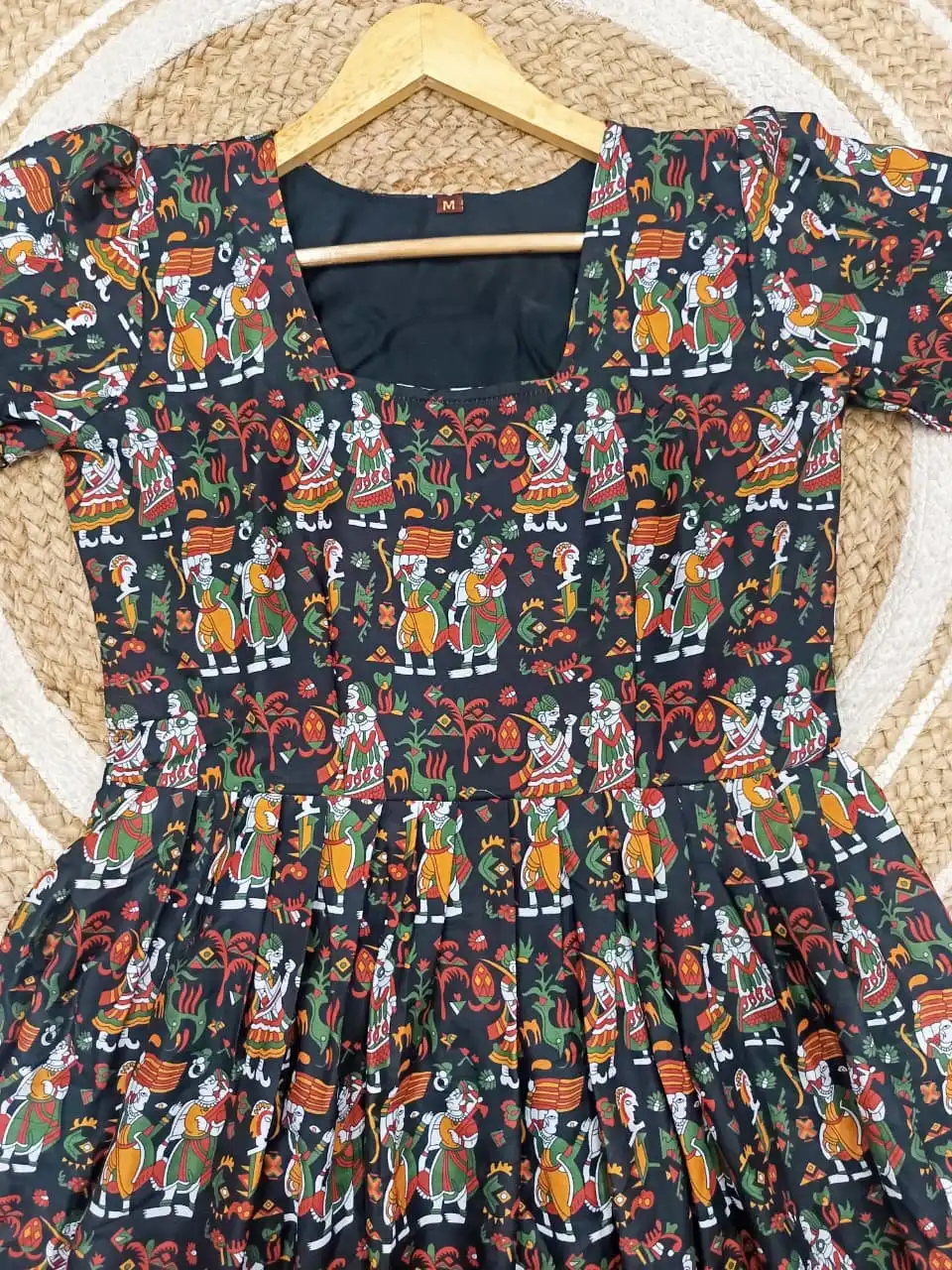 | Frock: | Soft Cotton (Muslin) Pattern: Traditional Folk Motif Digital Print Sleeves: half sleeves Length: 48+ Fit: Comfort fit with flowy silhouette |