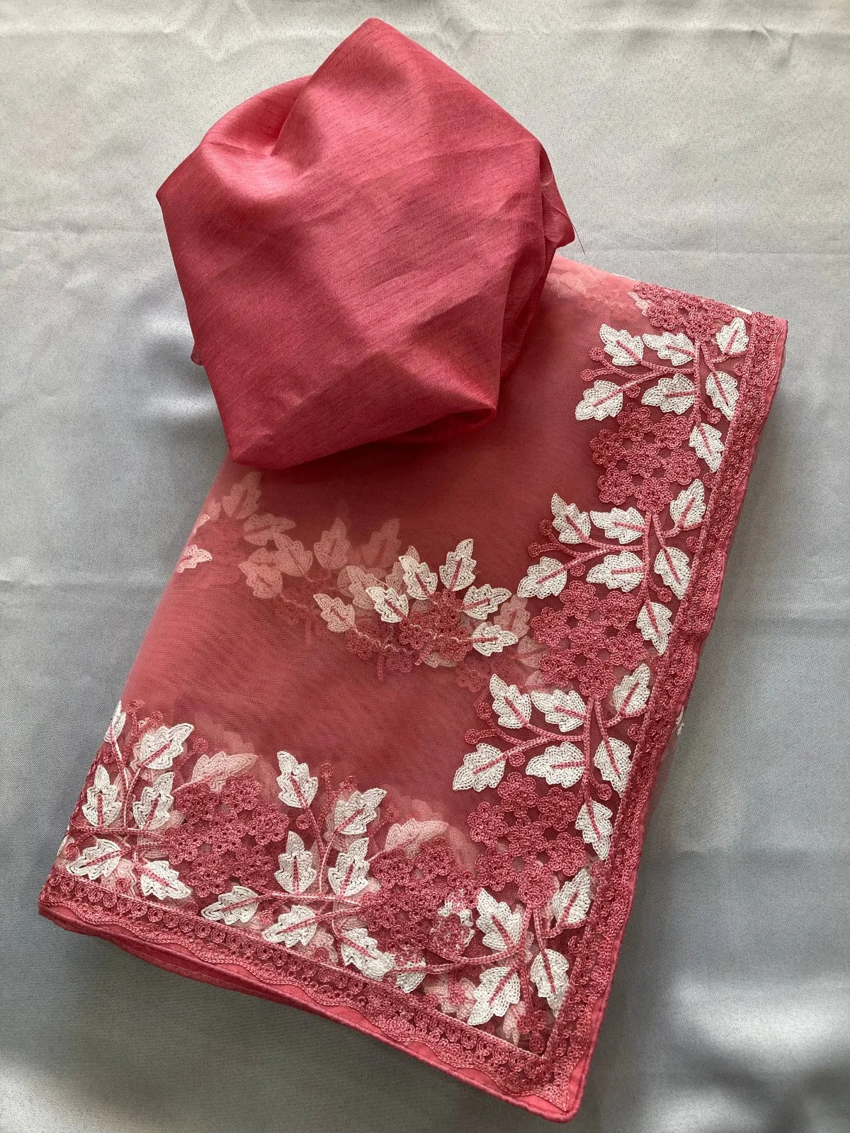 Saree: Soft Net, Work- C-Pallu Chikankari Embroidery, Cut- 5.5 mtr
