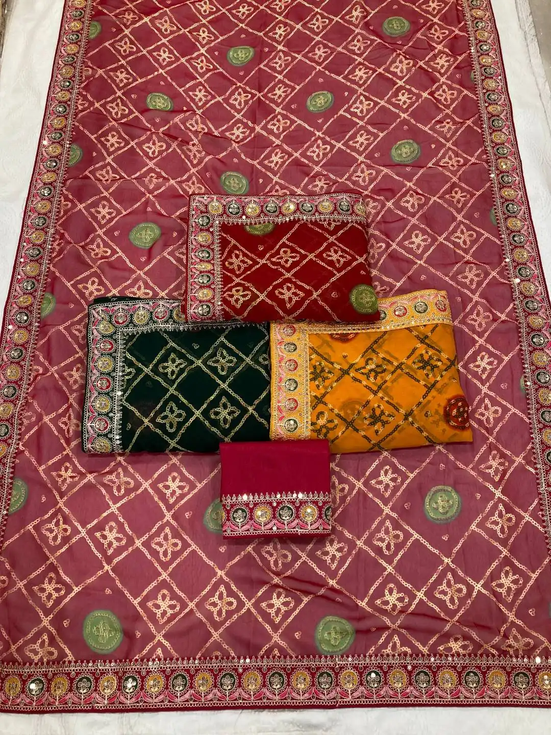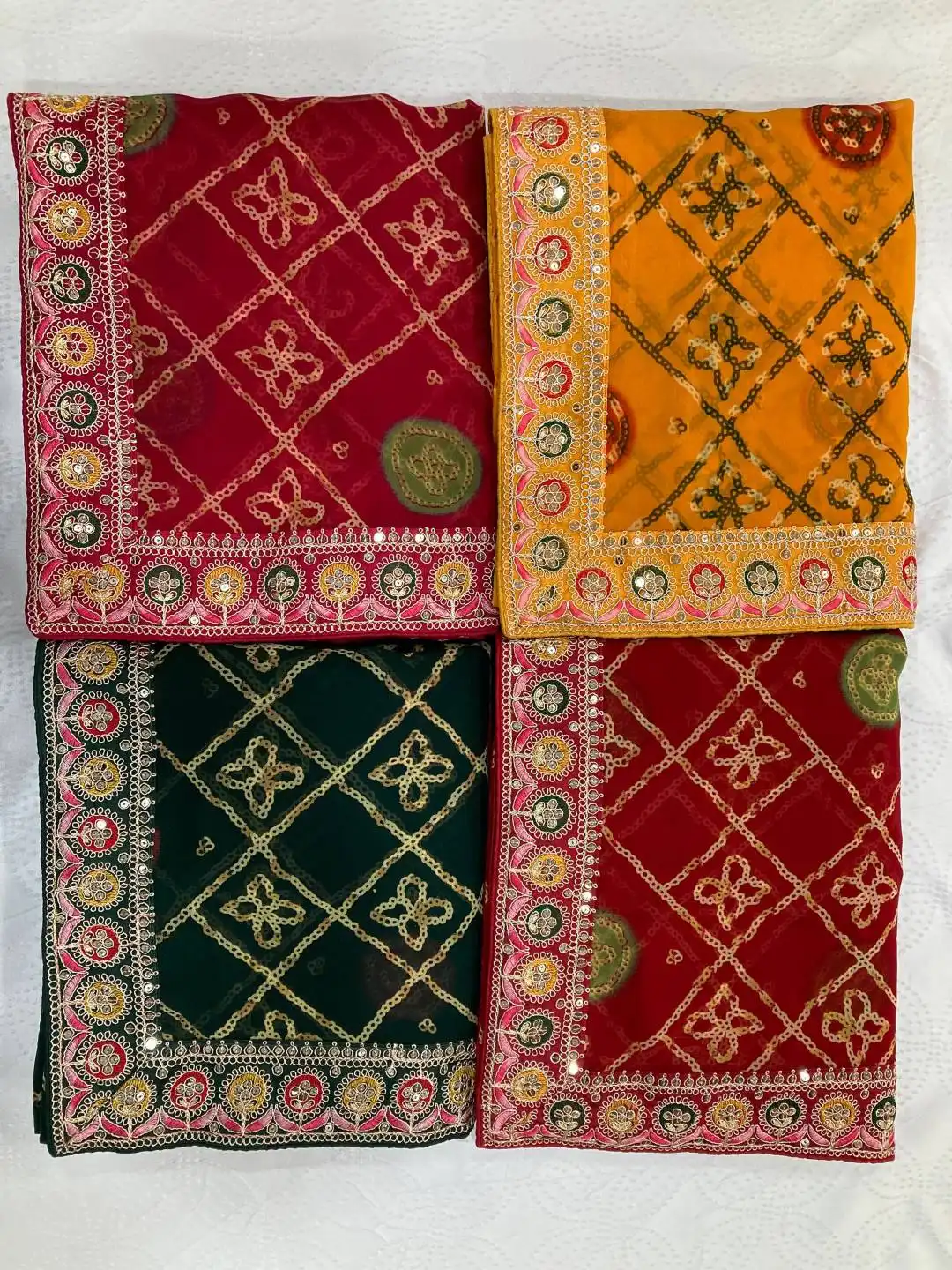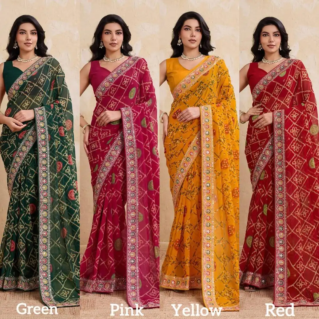 | Saree: | Georgette Work :- Bandhej Print With Cutwork Lace Border Cut :- 5.5 mtr |