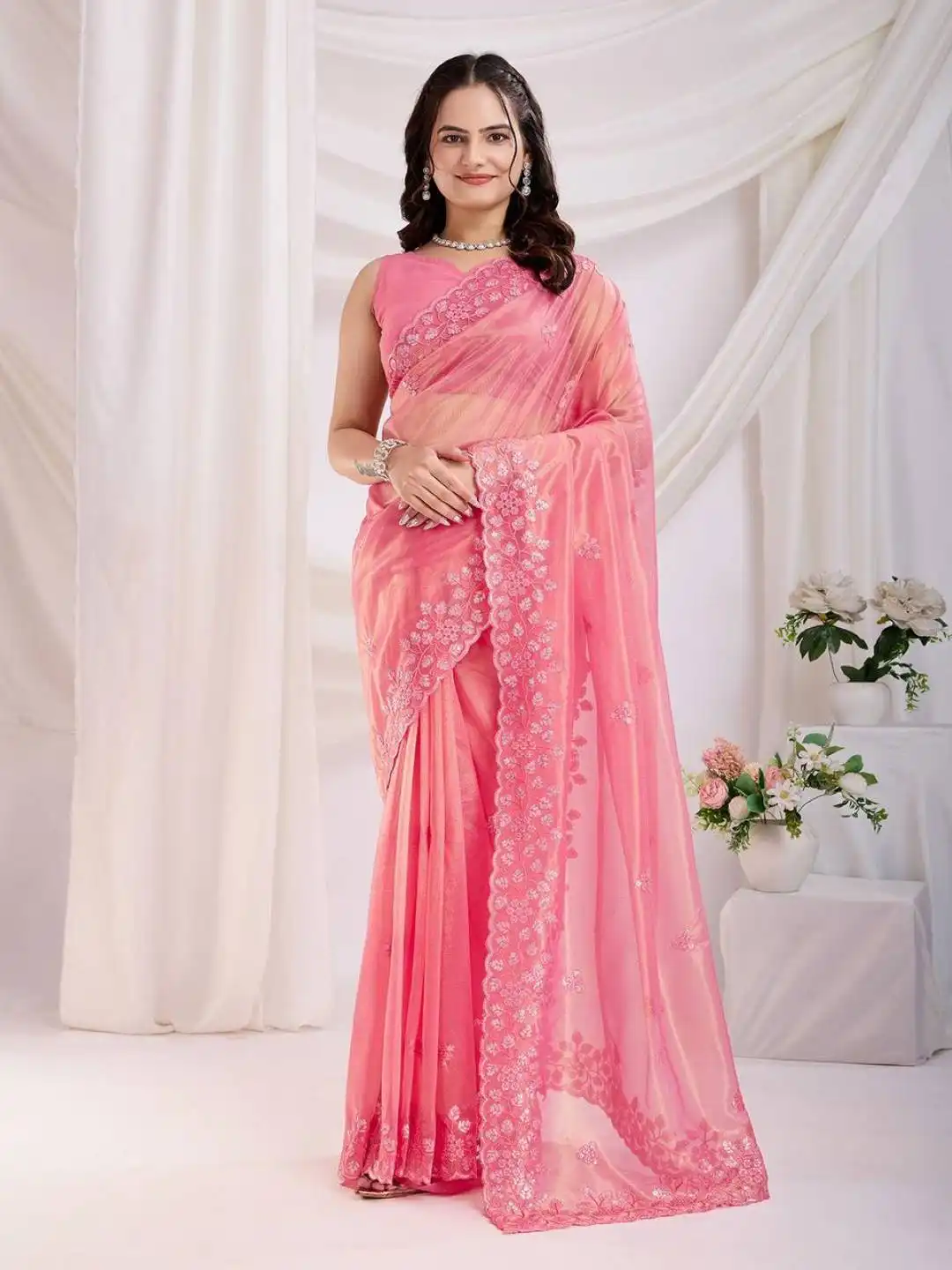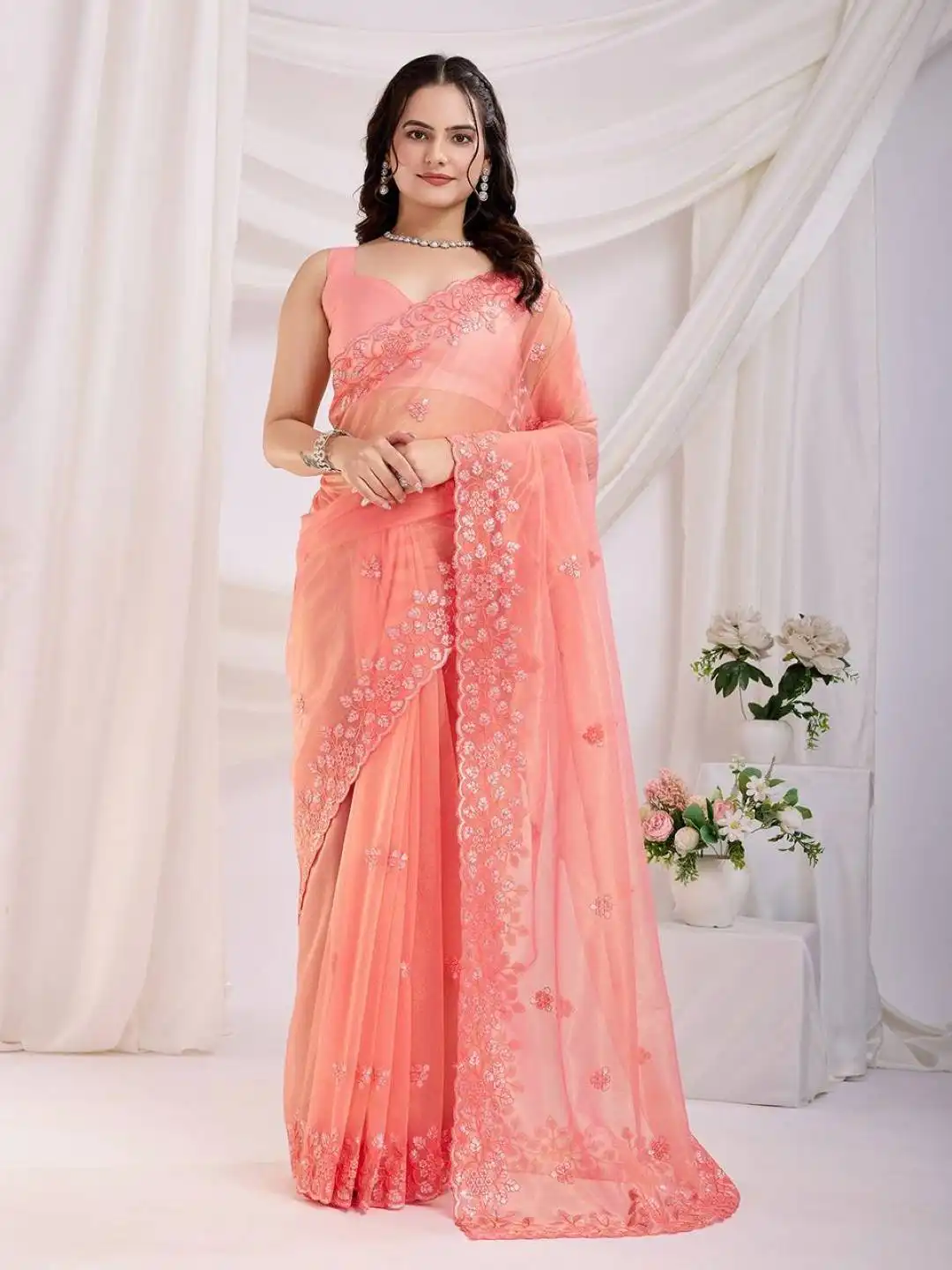Saree: | Gold Twill net : Work :-sequins embroidery with cut work | Cut :- 5.5 mtr |