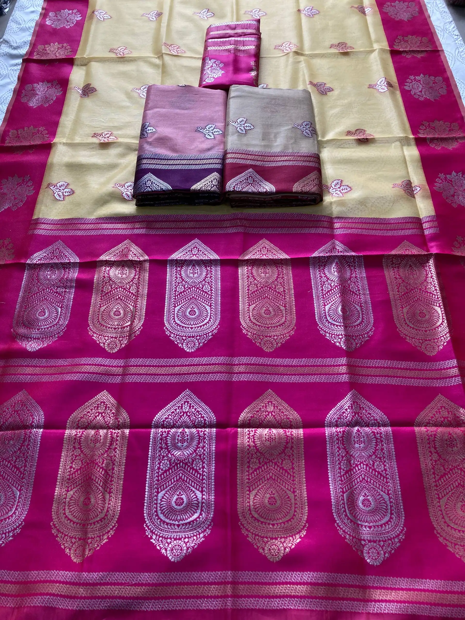| Blouse: | Running Cotton Silk Work :- Banarasi zari Woven Border With work Cut. :- 0.90 mtr (Un-stitch) |