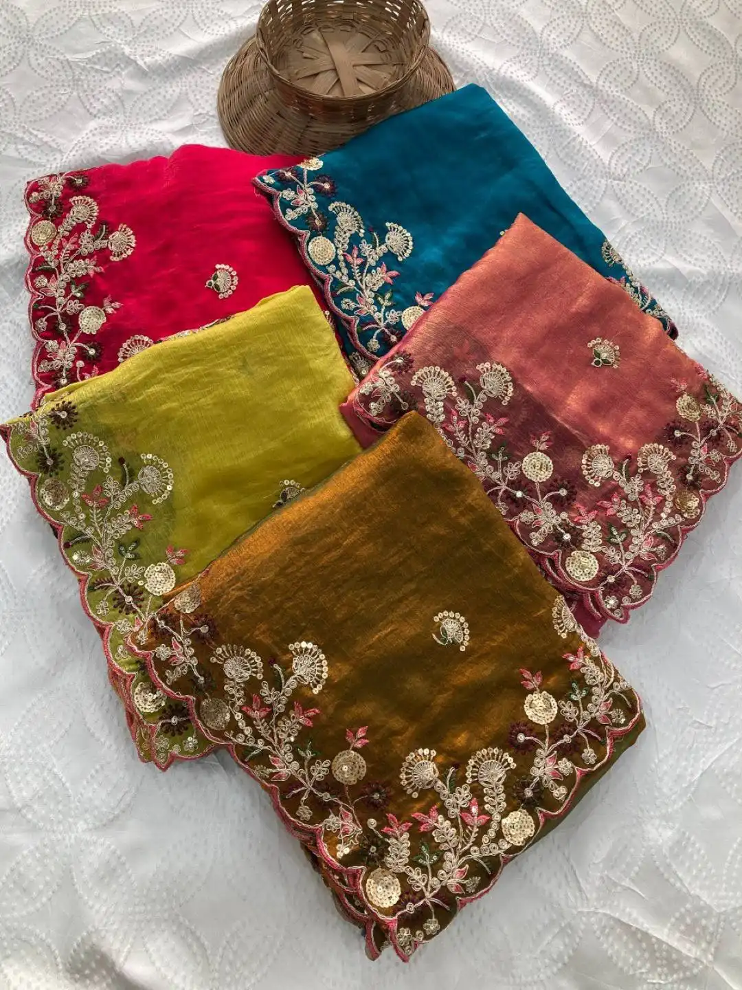 | Saree: | Soft Fendy Chiffon Work :- Embroidery Cutwork work aarco border Cut :- 5.5 mtr |