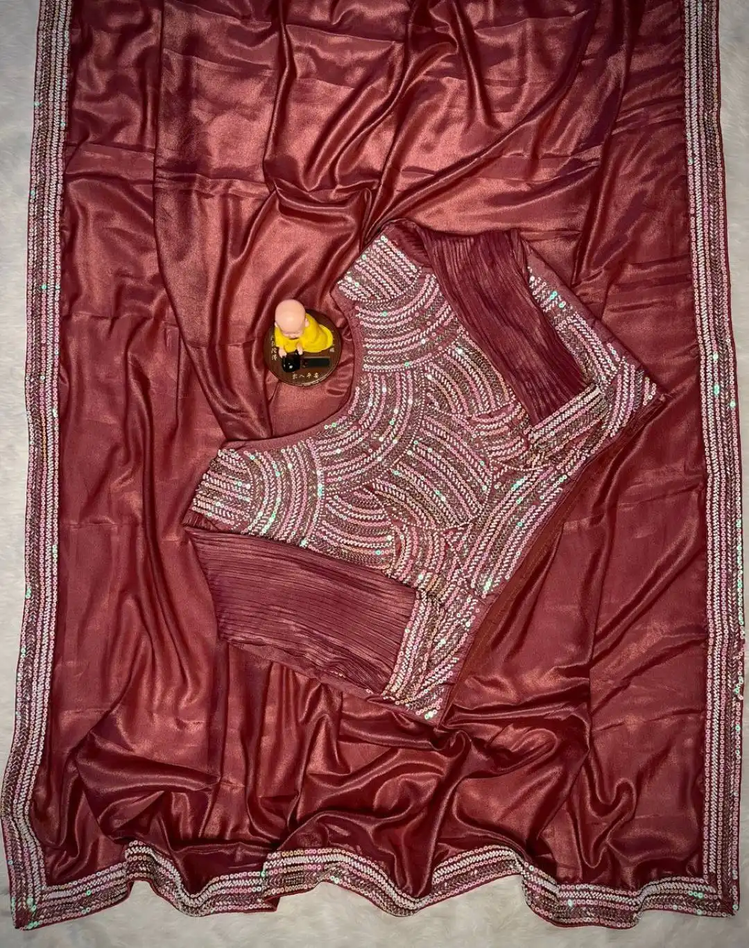 | Saree: | Heavy Choklate Georgette with Kat dana bits work piping lace border Length:-5.50MTR |
