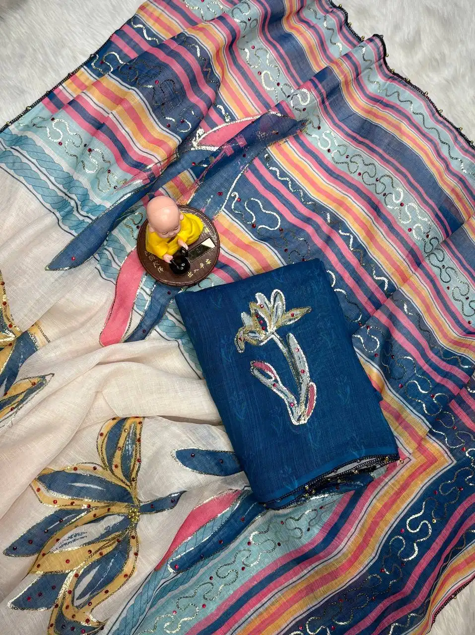 | Saree | Pure Soft linen coton silk with digital print and Khatli and foil work with stone attched | Length:-5.50 mtr |