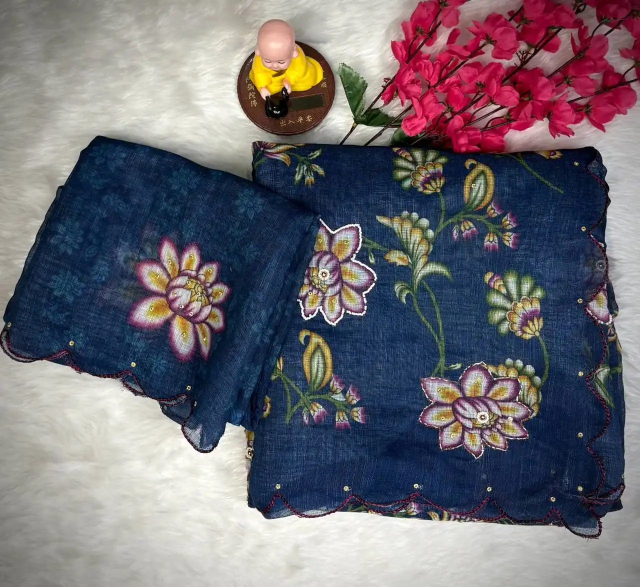 | Saree | Soft cotton linen with digital print and khatli wok . Beautiful cut work border with arco | Length:-5.60 MTR |