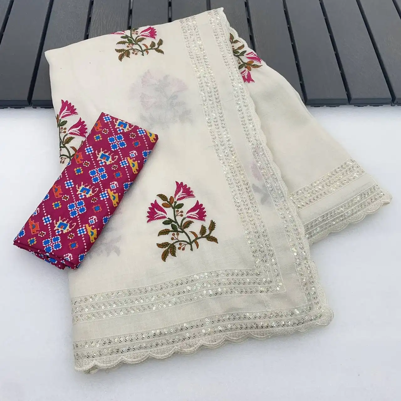 Saree: Premium Vichitra fabric with c pallu embroidery work and multi Thread work with arco cut work border | Length:-5.50 Mtr