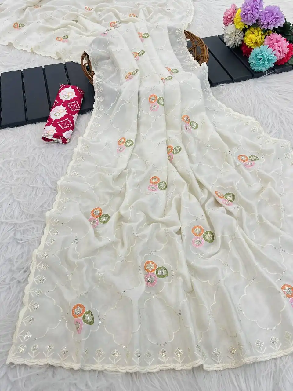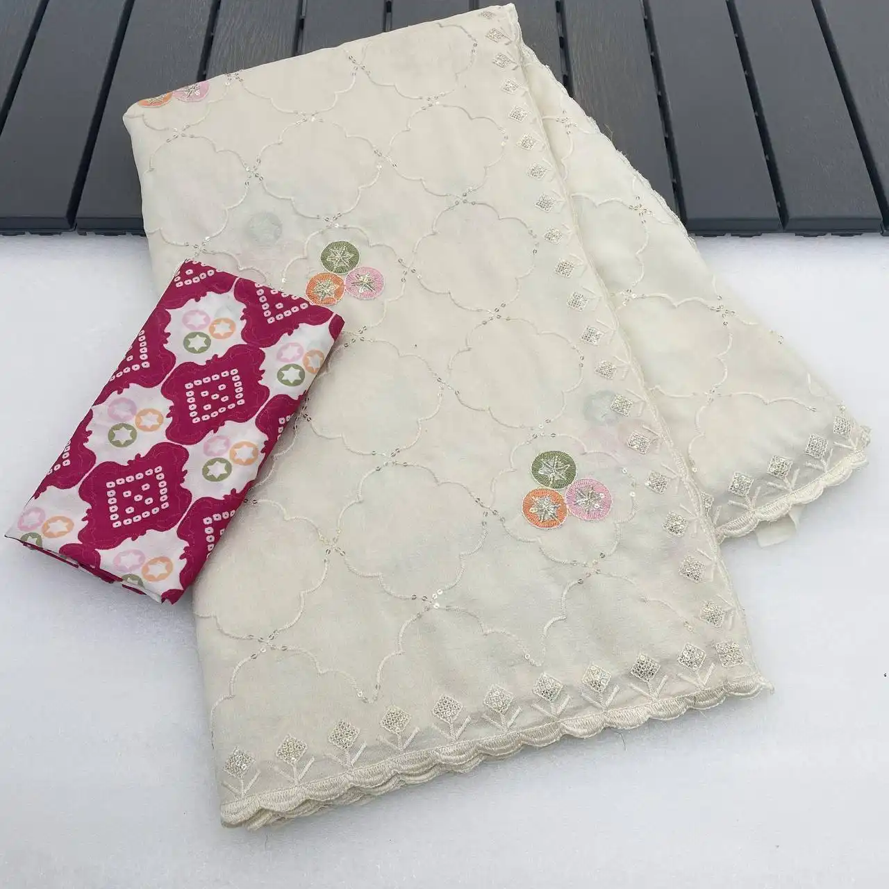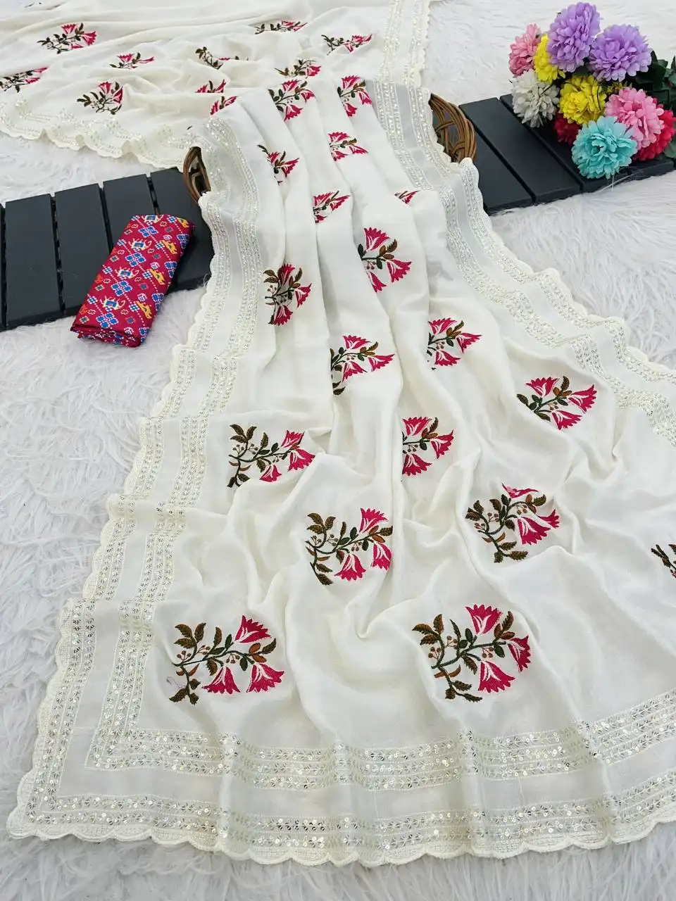 Kusum 825 White Vichitra Heavy Work Saree Printed Blouse Collection