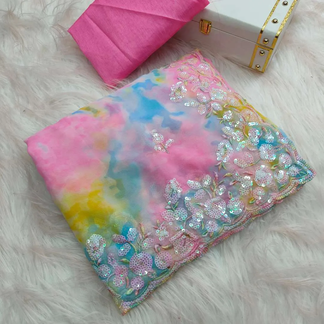 Saree: Chiffon Georgette fabric with Prizam print and c pallu dual sequence embroidery work and cutwork border