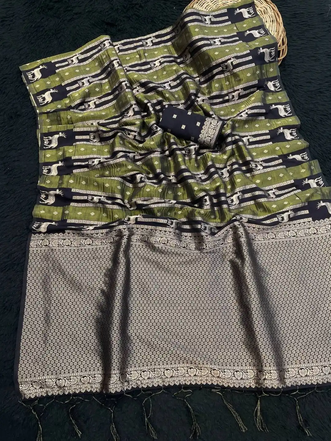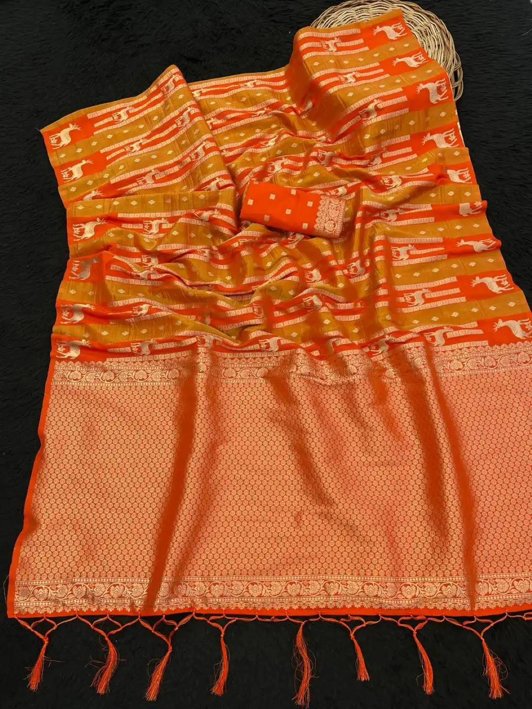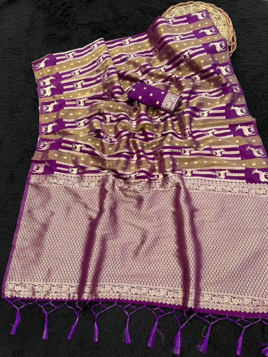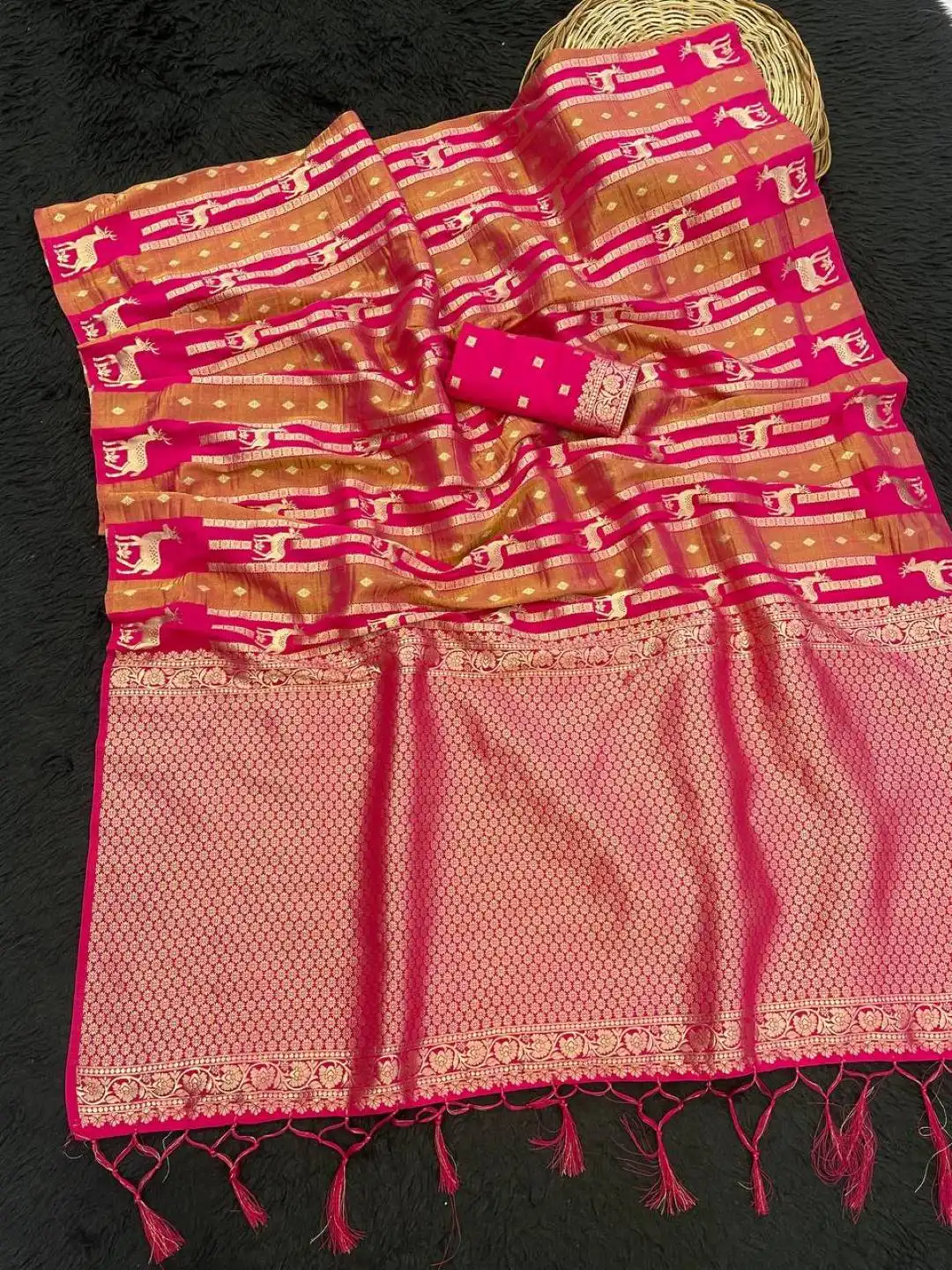 | Saree: | Rich Crepe Khadi tissue Paithani silk saree with Rich Jari Wooven Pallu with attached tassels and Golden jari Kalakari & peacock weaving all over the body. the border Subtle jari butti weave across the saree surface |