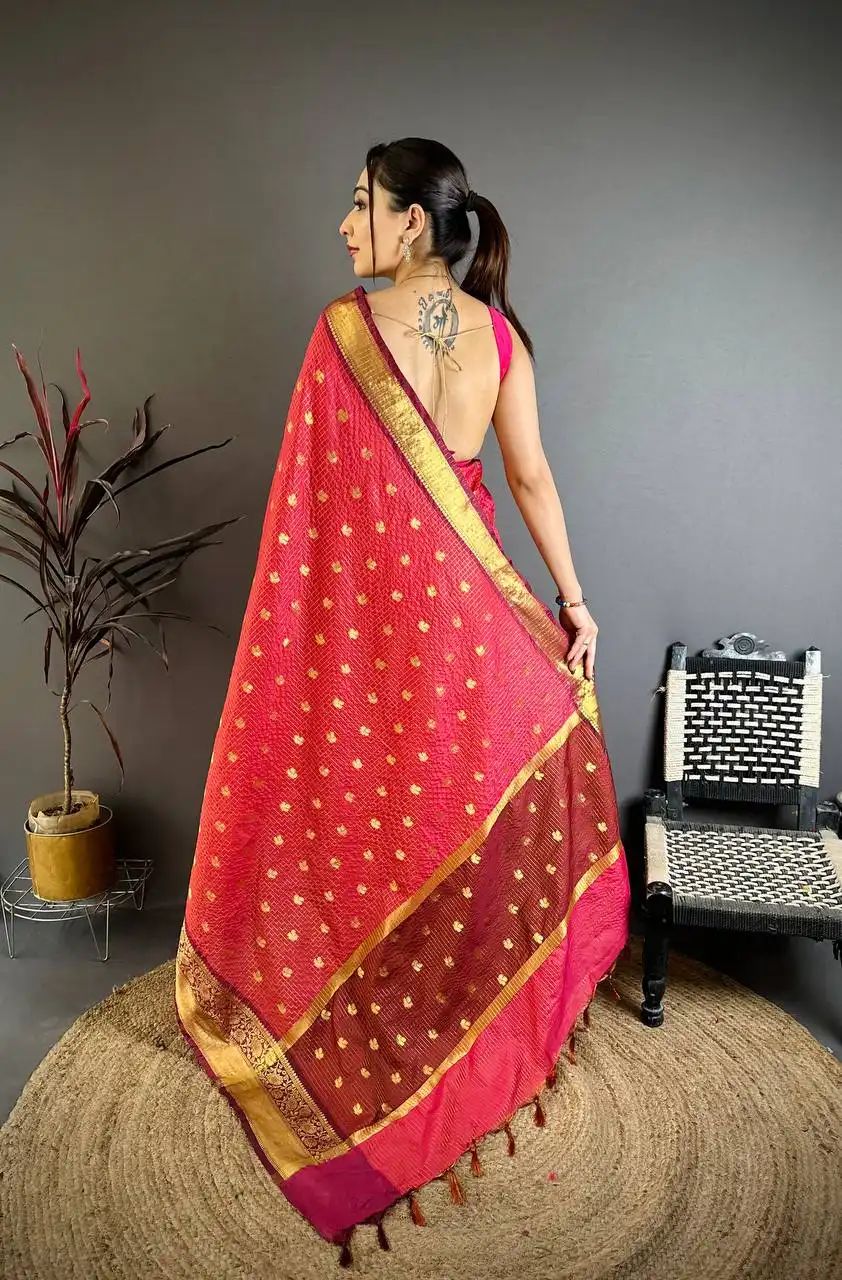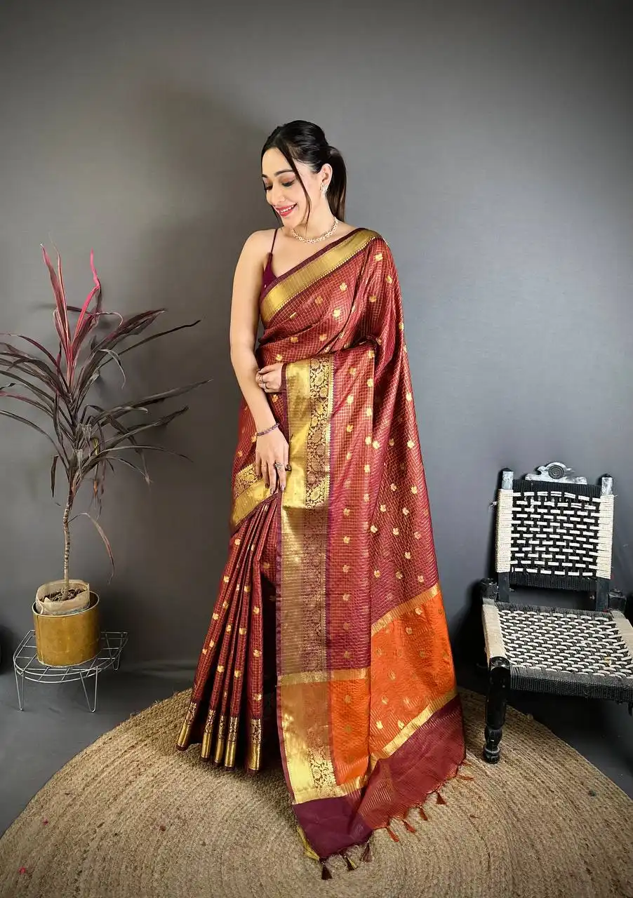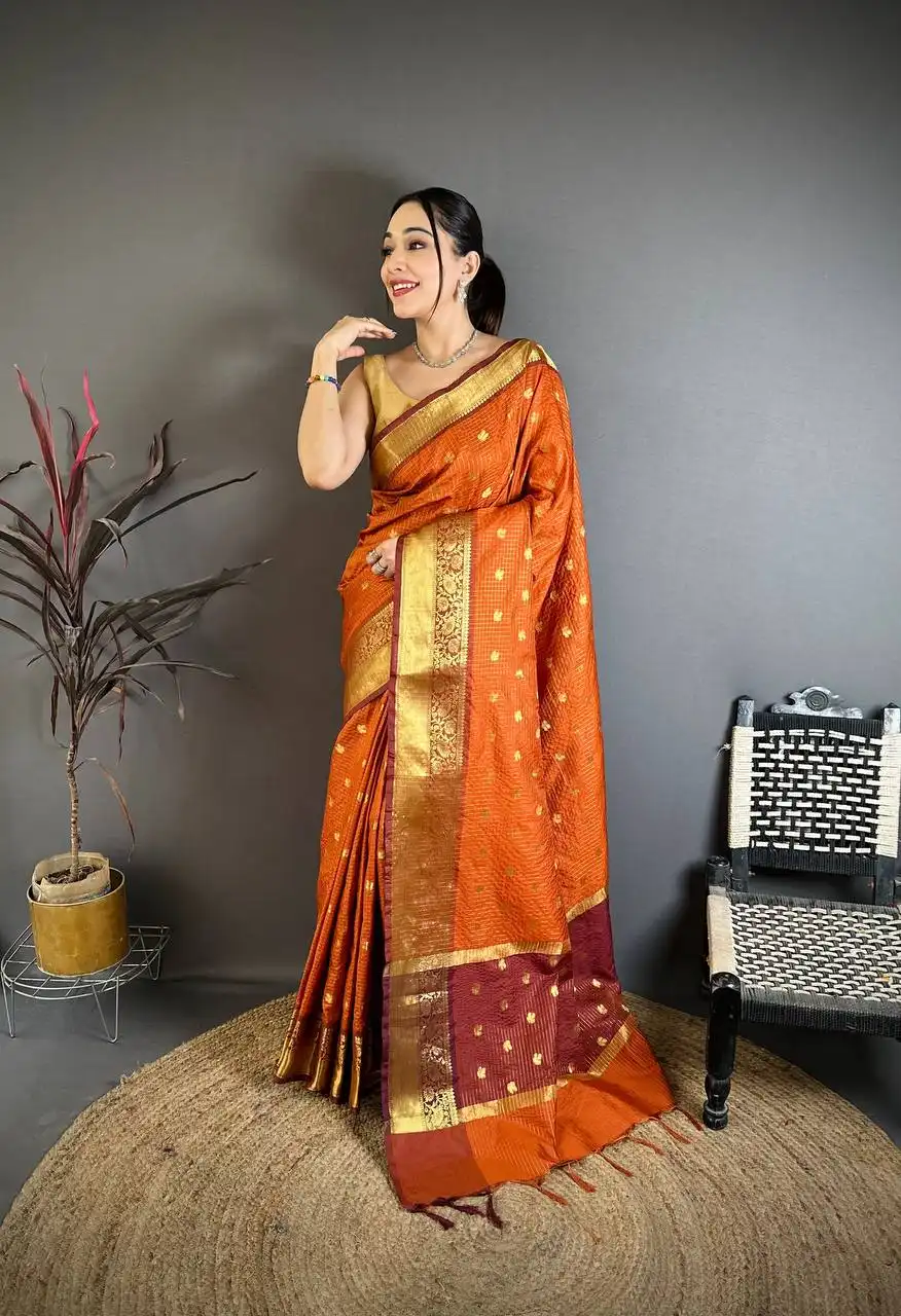 | Saree: | BANARASI TISSUE SAREE IN RUEST COLOUR COMBINATION WITH ALL OVER WEAVING BUTTI WORK WITH HEAVY BORDER |