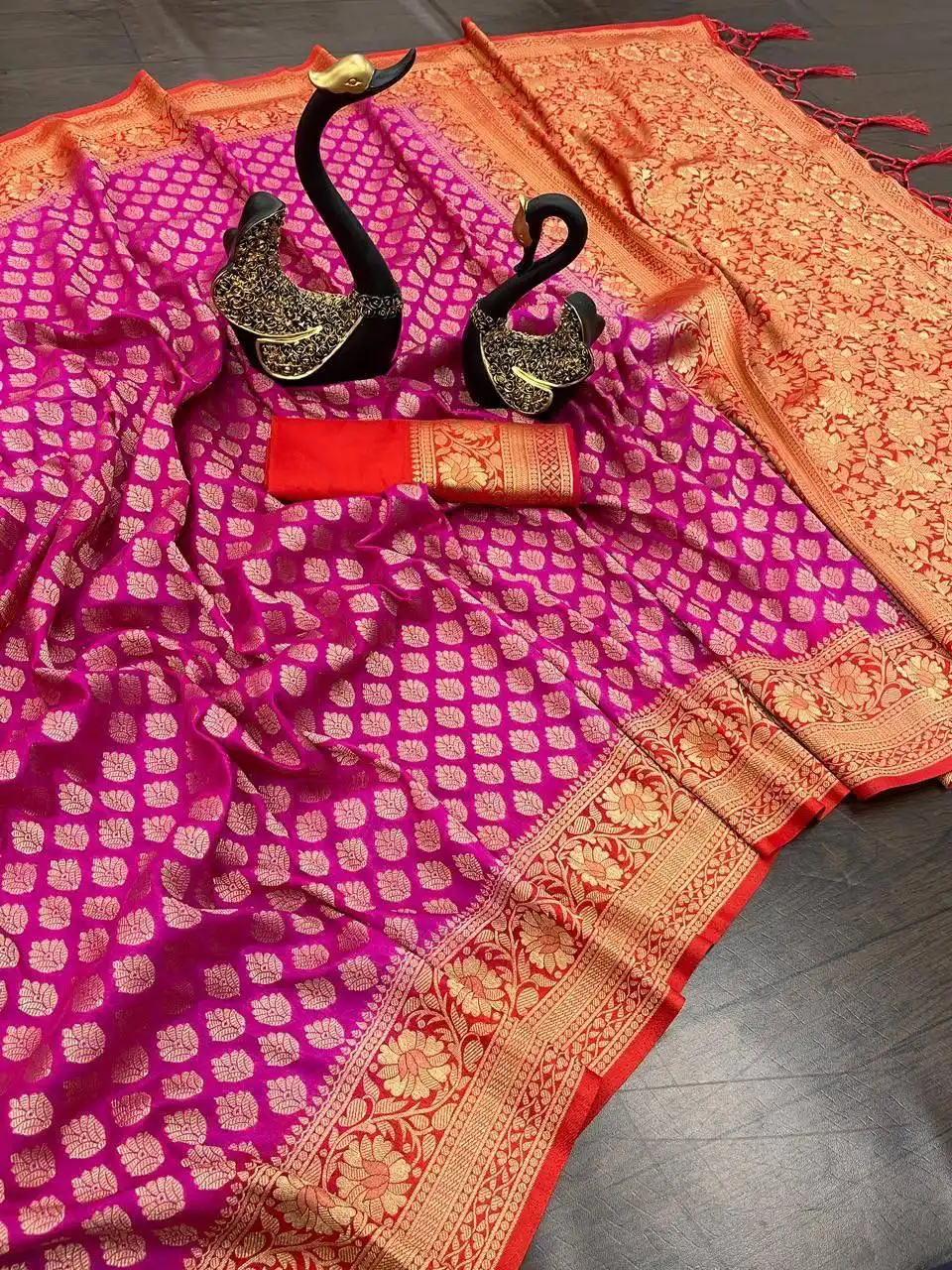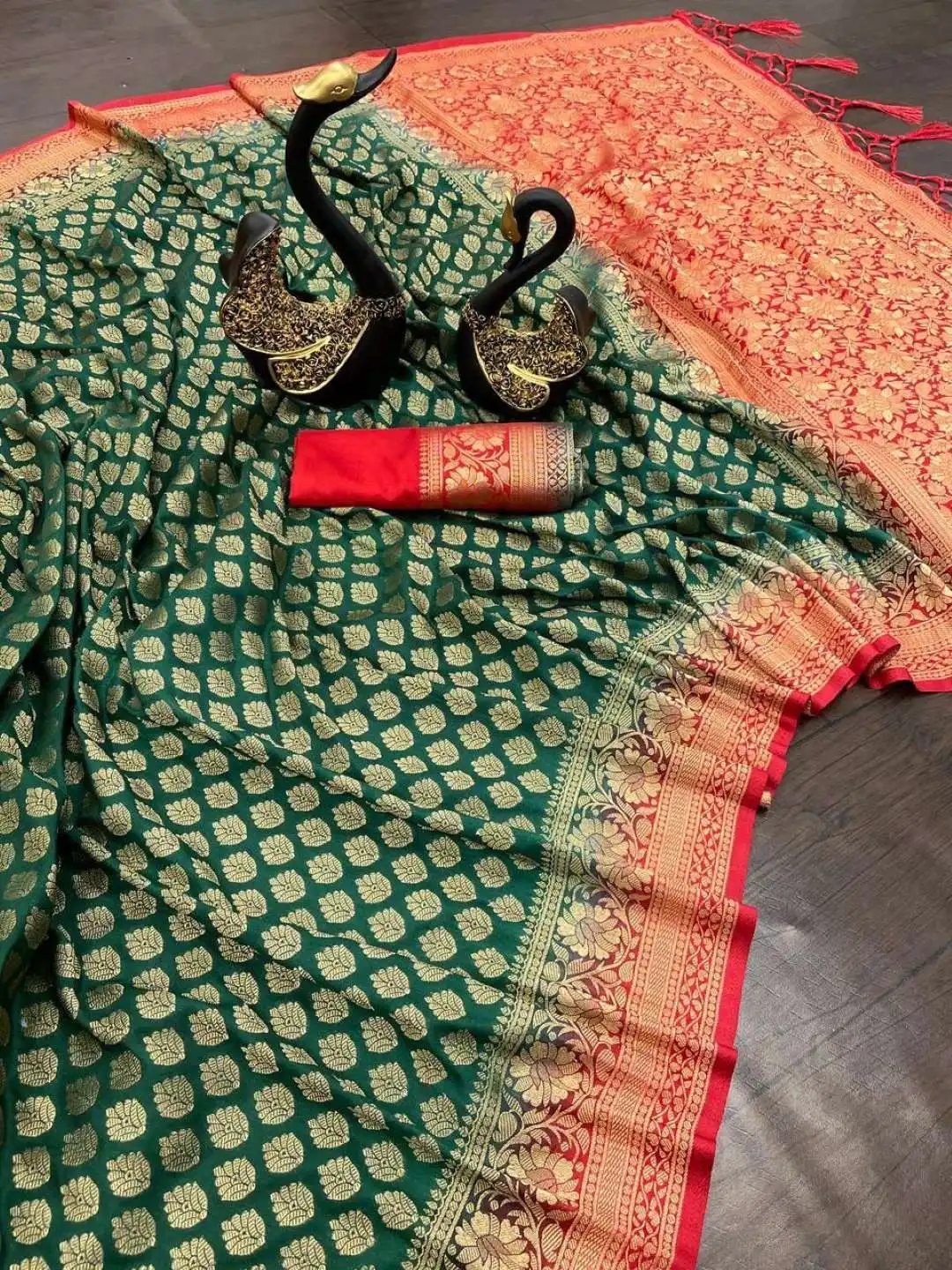 | Saree: | Pure Soft Khadi Georgette Silk Saree With Rich Zari Wooven Pallu Pairs With Fancy Tassels Having Heavy Wooven Border With All Over Zari Weaving in Full Saree |