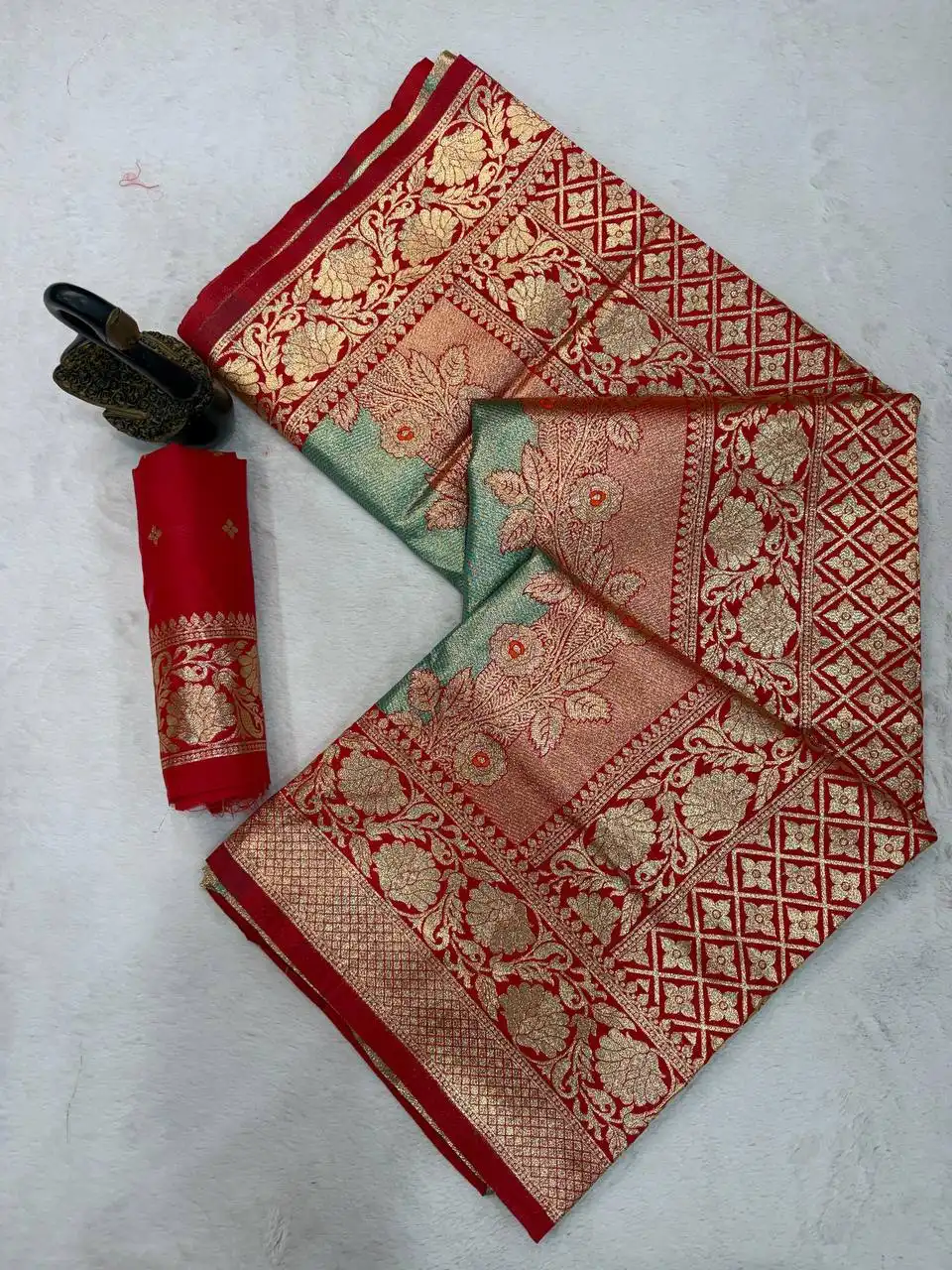 | Saree: | Soft And pure banarasi silk saree with Flowers And Mina design all over the saree & zari weaving Rich pallu with zari weaving unique border & heavy rich Pallu |