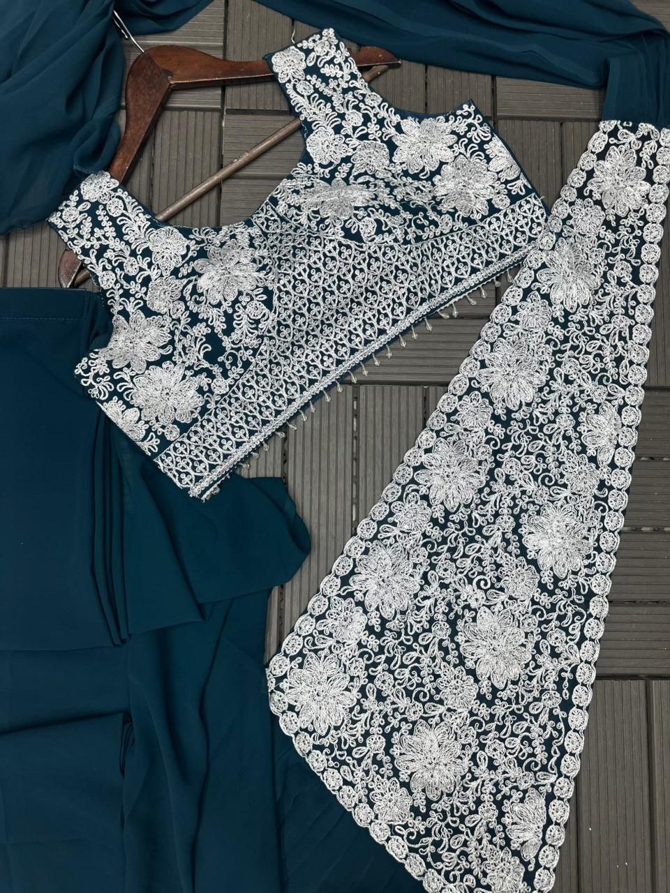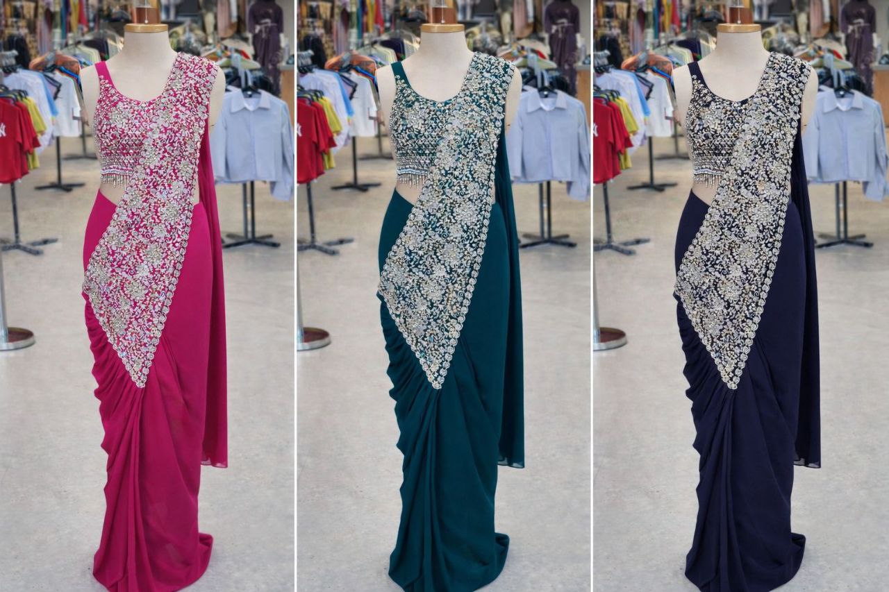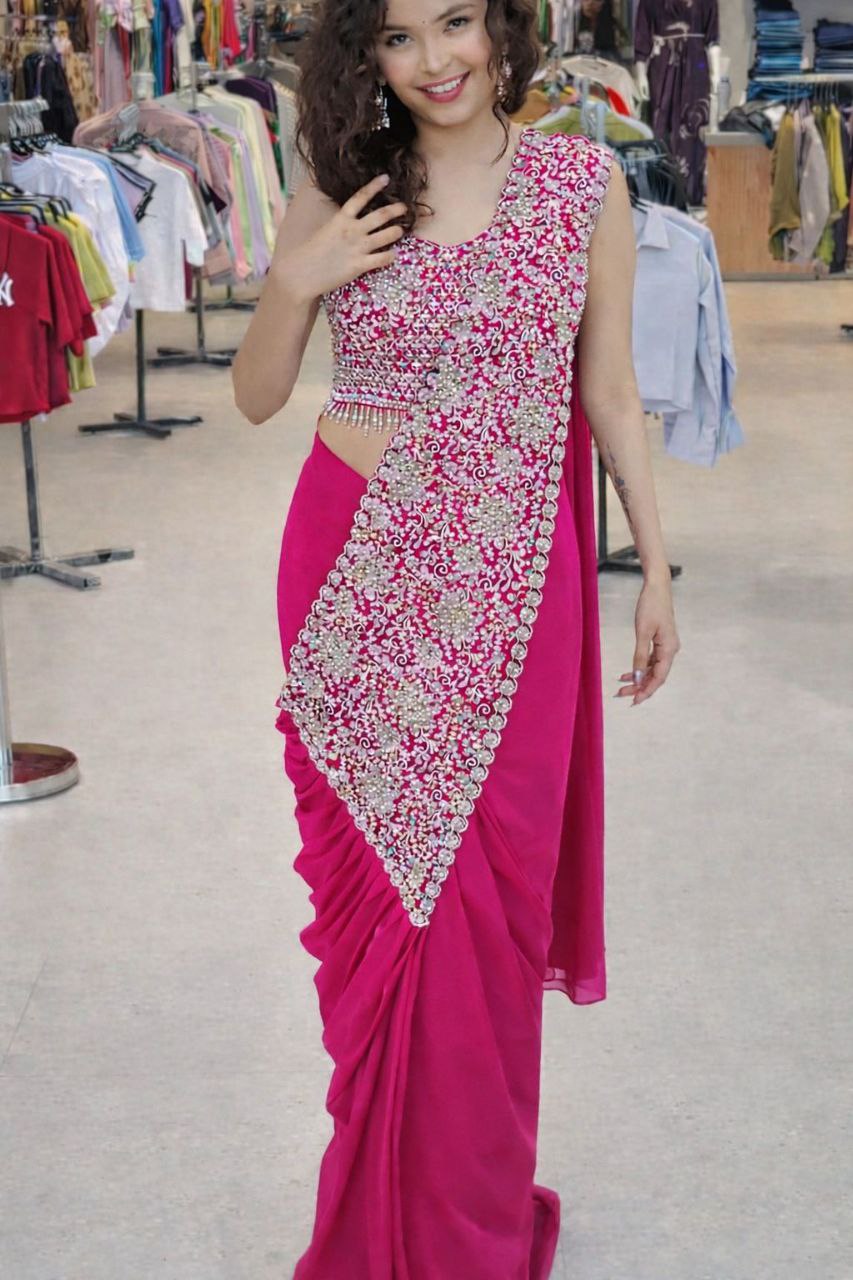 | Saree: | Heavy Fox Georgette Work: Embroidery sequence work Stiching type : Ready to wear sleeves extra |