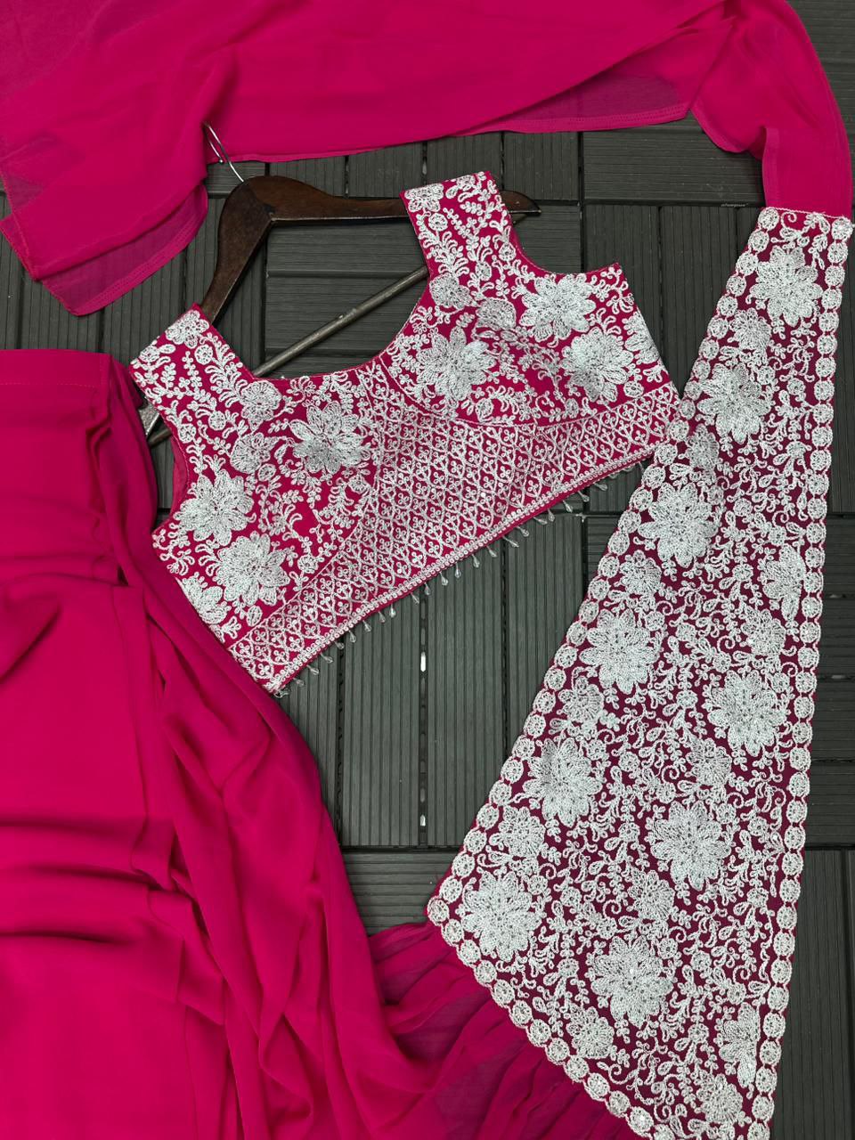 | Blouse: | Fox Georgette Work- Embroidery Sequence work ( full Stiched) Size- Full Stiched upto 42 |