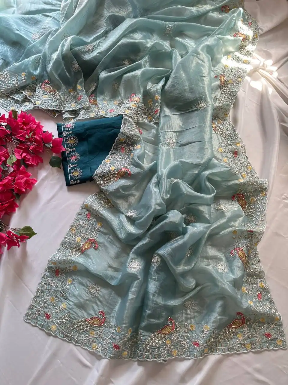 | Saree: | Organza saree | hand-embroidery | peacock & floral motifs | Premium cutdana work detailing | Scalloped embellished borders |