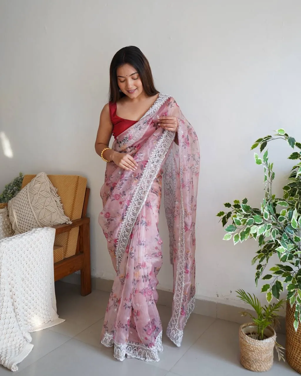 | Saree | Pure organza silk saree with digital floral prnt on all over saree with silver zari embroidered work with hand moti work on border |