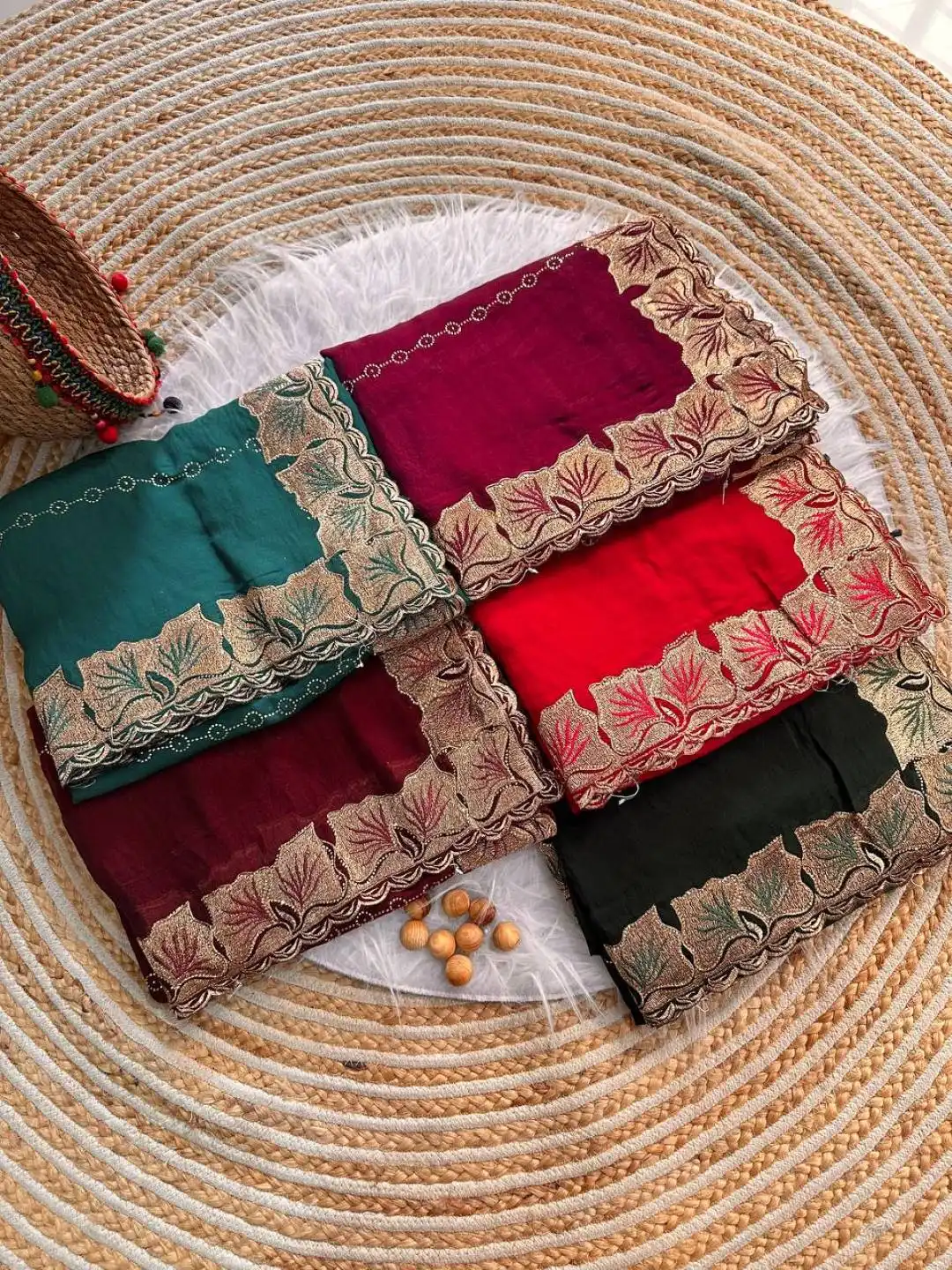 Saree: Soft Fandy sattin silk (lightweight & flowy) Work: Heavy Golden Embroidery Border + Diamonds Line Work Perfect For: Festivals, Pooja, Family Functions, Gifting & Everyday Elegance
