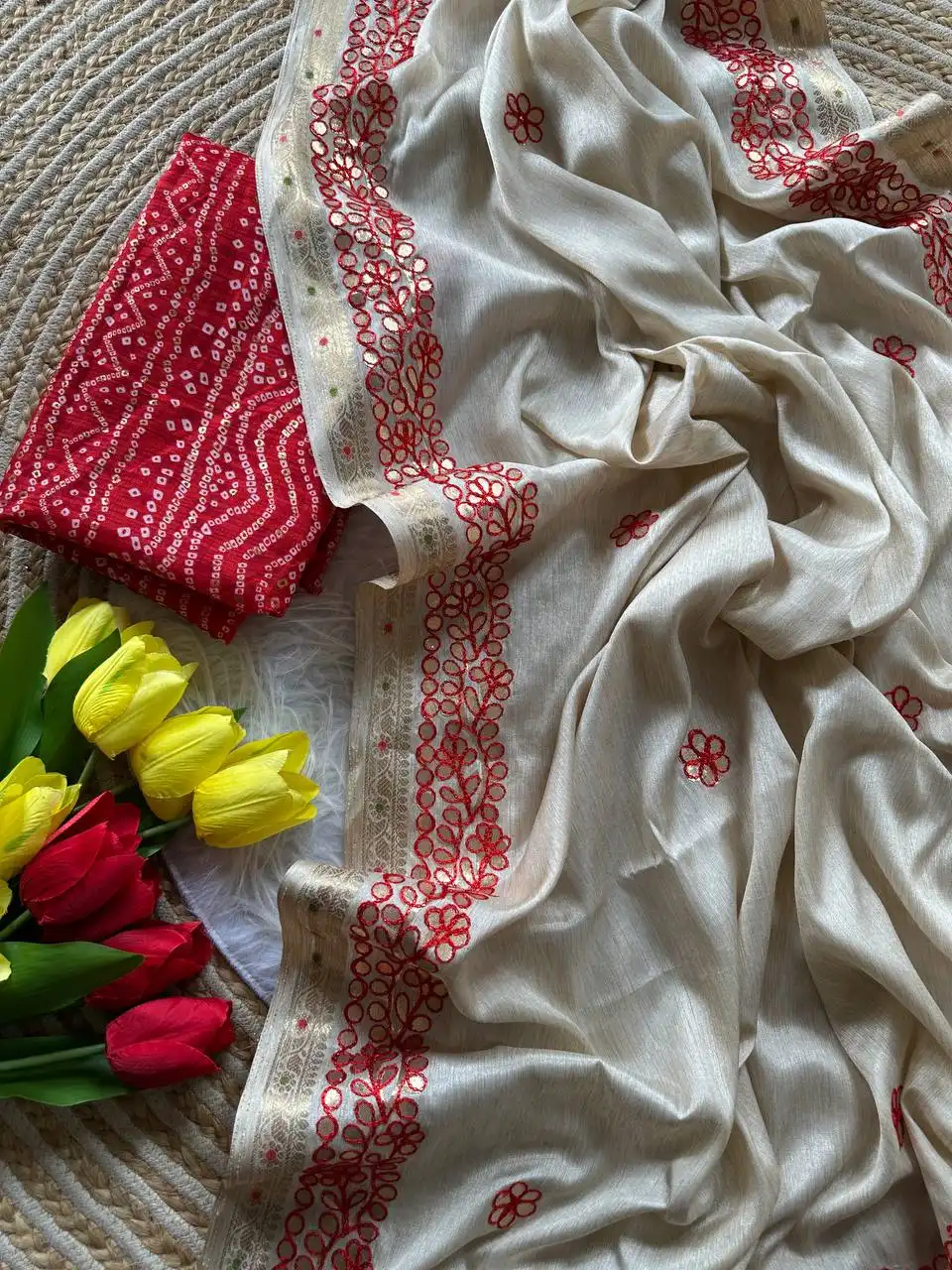 | Blouse: | Raw silk with bandhani print |
