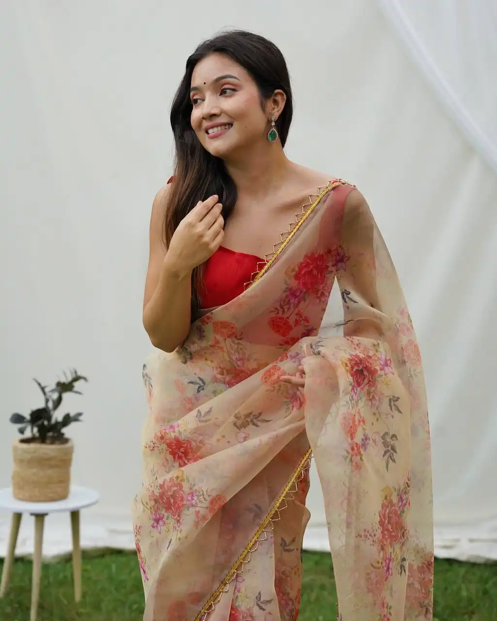 | Saree: | Pure organza silk saree with beautiful floral digital print in all over saree attached a golden cutdana moti border |
