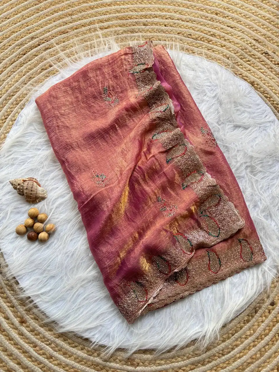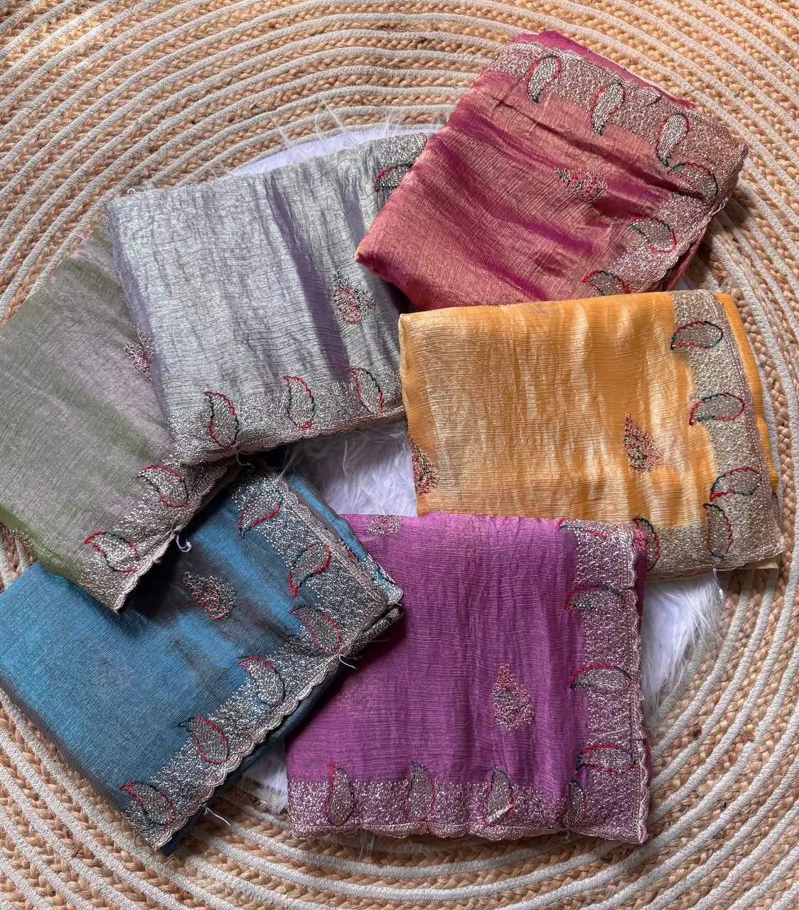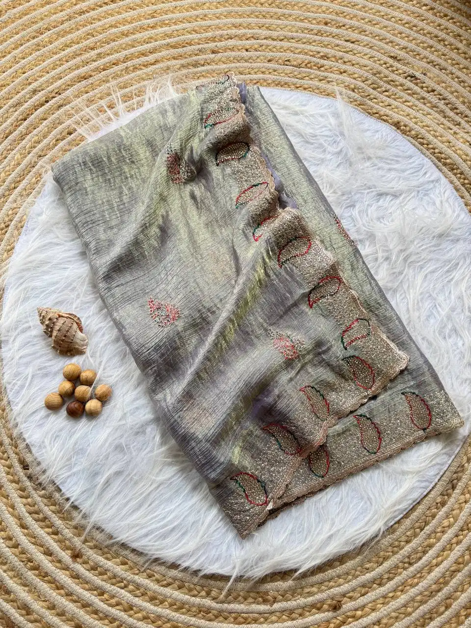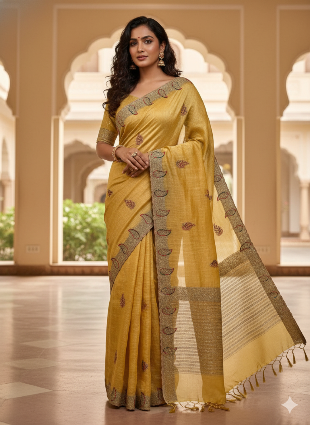 Saree: | stunning silk-textured saree | ari and thread embroidery in paisley motifs. |