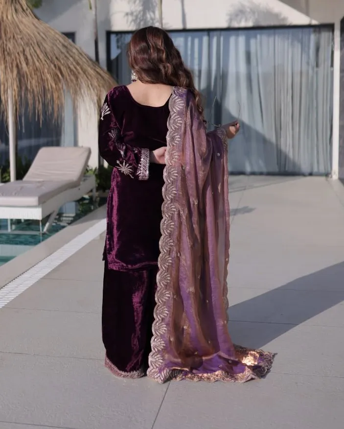 Top Ice Velvet with Rich Zari Embroidered work, LENGTH- 36 INCH, LINING- Cotton (Full Inner), SLEEVES- Full Sleeves (Bell Sleeve), NECK TYPE- Fancy V Neck, STITCHING TYPE- Standard Stitching