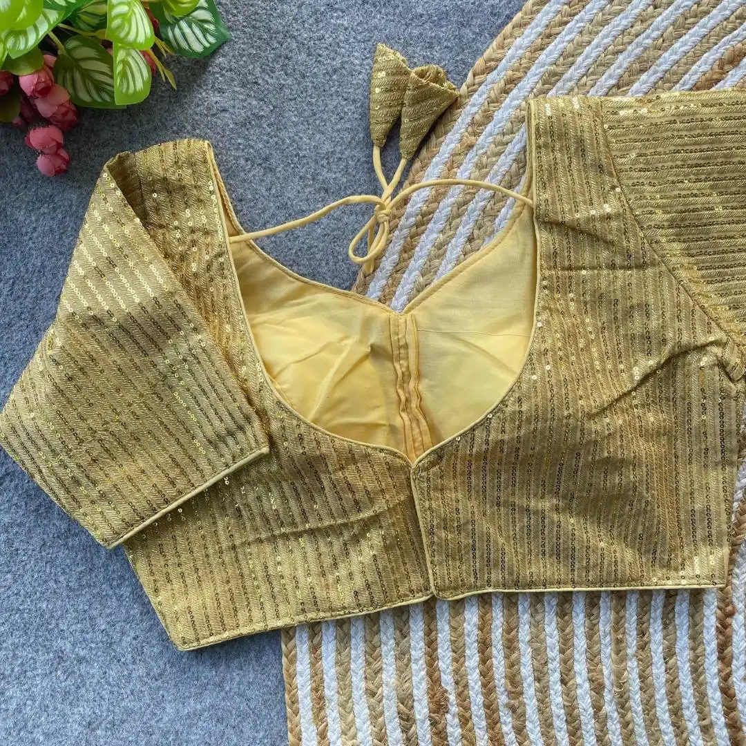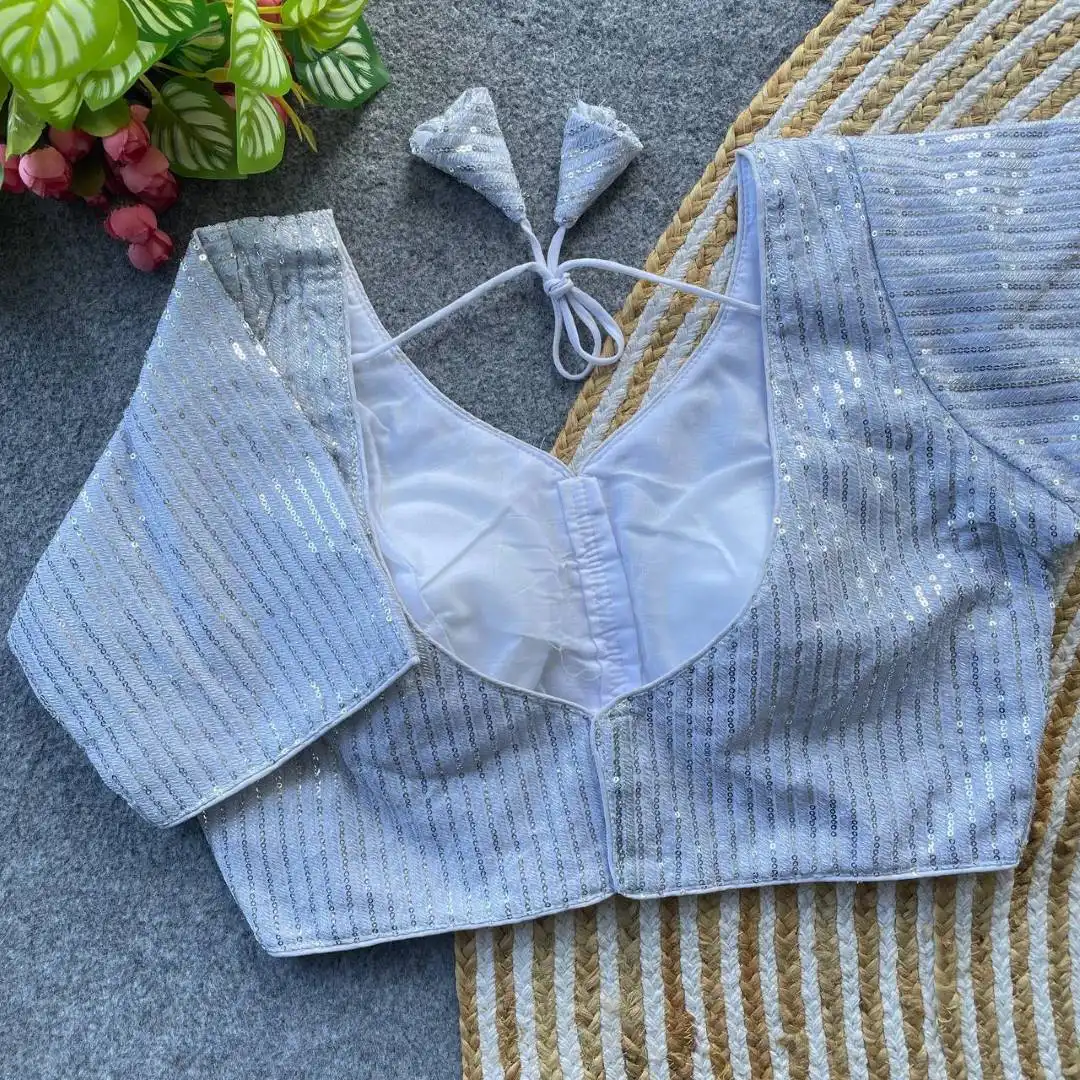 | Blouse: | Gorgette | Work: Tone to tone thread with sequence work | Back Side: Beautiful hook style at back for perfect fitting and elegant look |