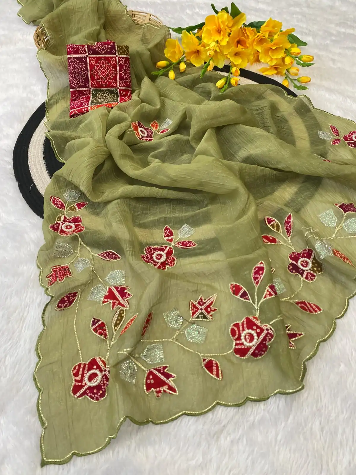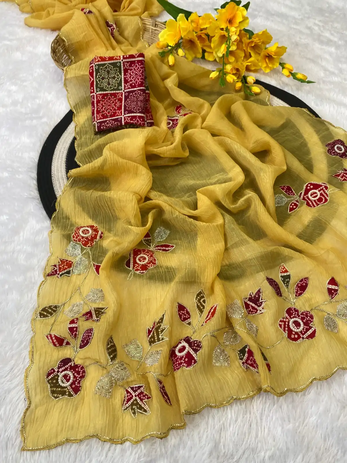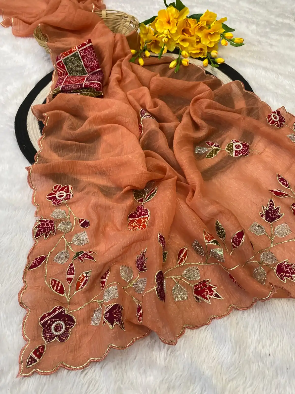 Saree:Crunchy Chiffon Premium Quality U Pallu | Patch Work And Handwork Border Designer Saree With C Pallu