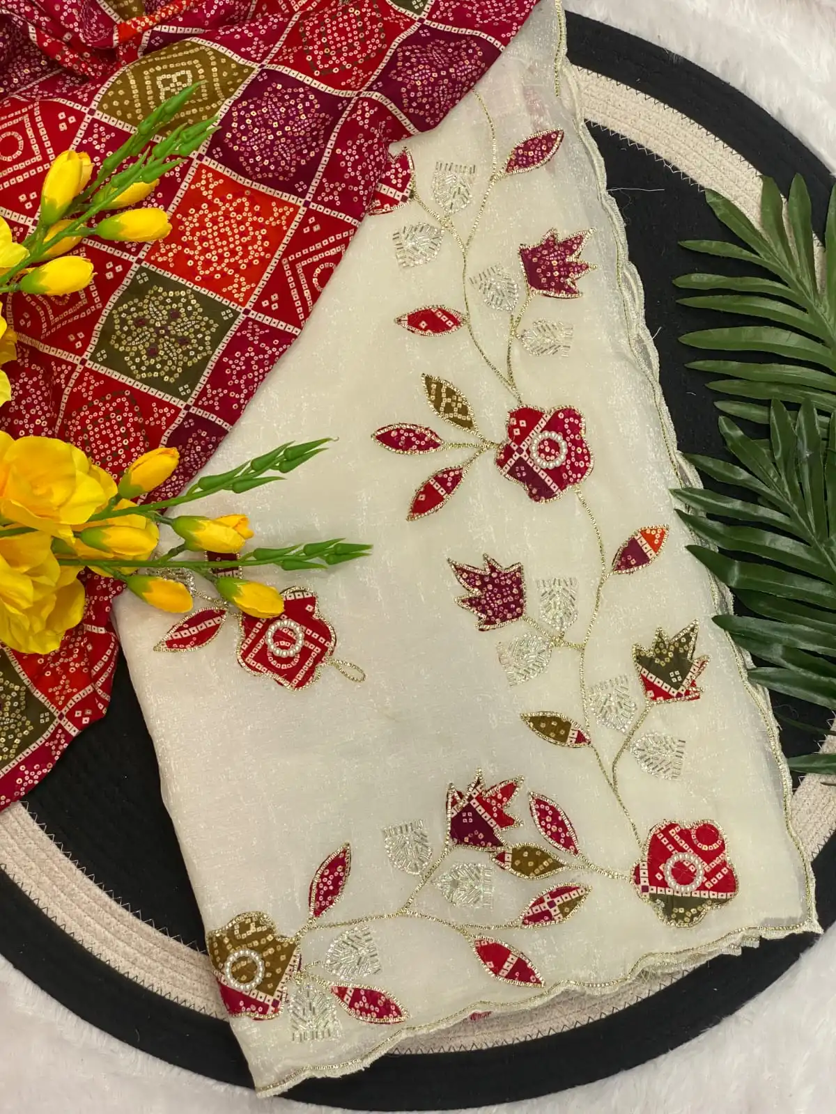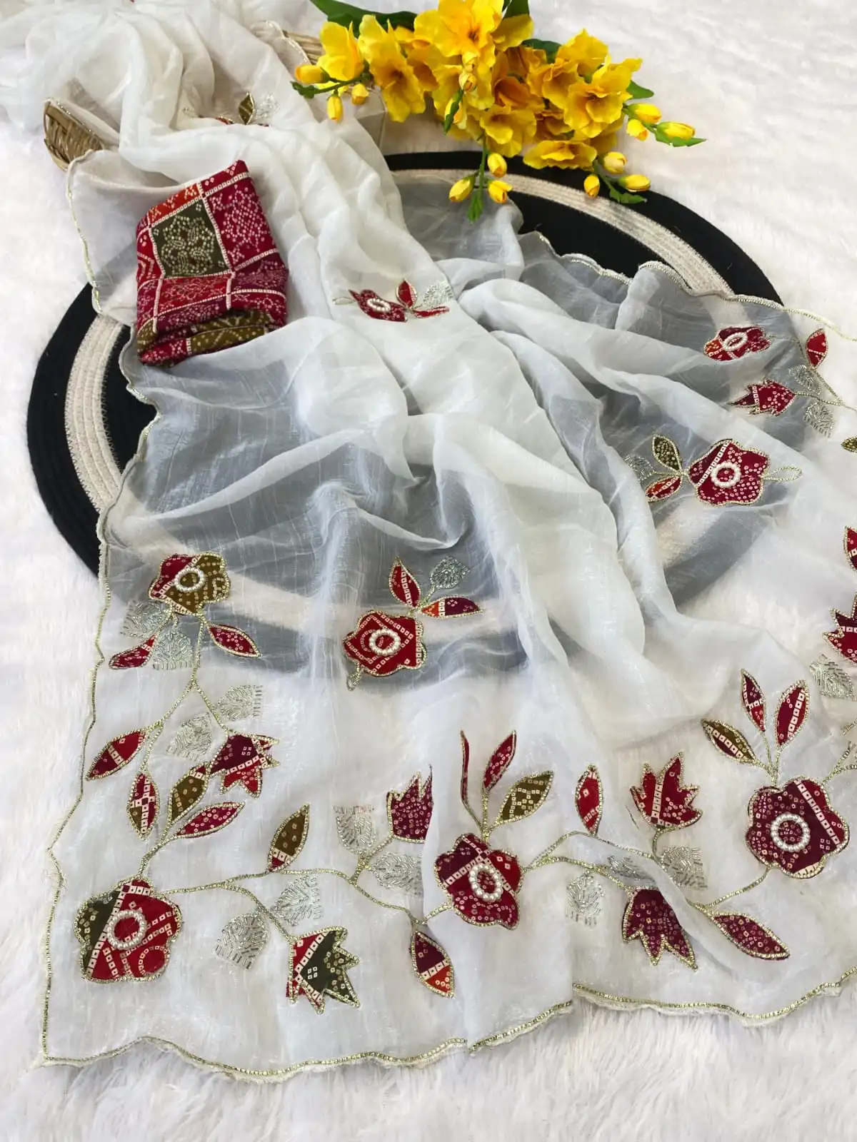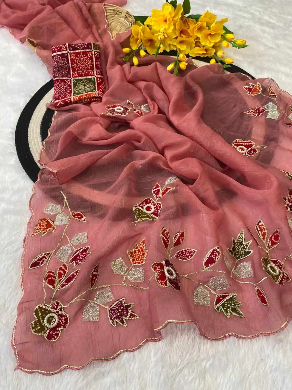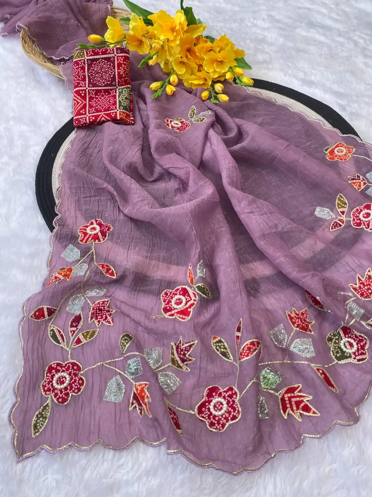 Saree:Crunchy Chiffon Premium Quality U Pallu | Patch Work And Handwork Border Designer Saree With C Pallu