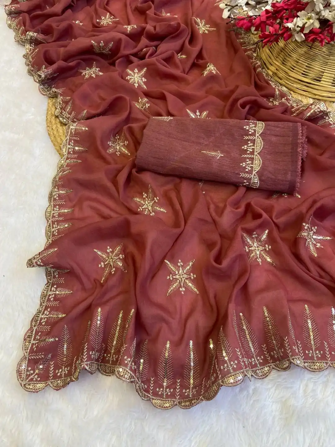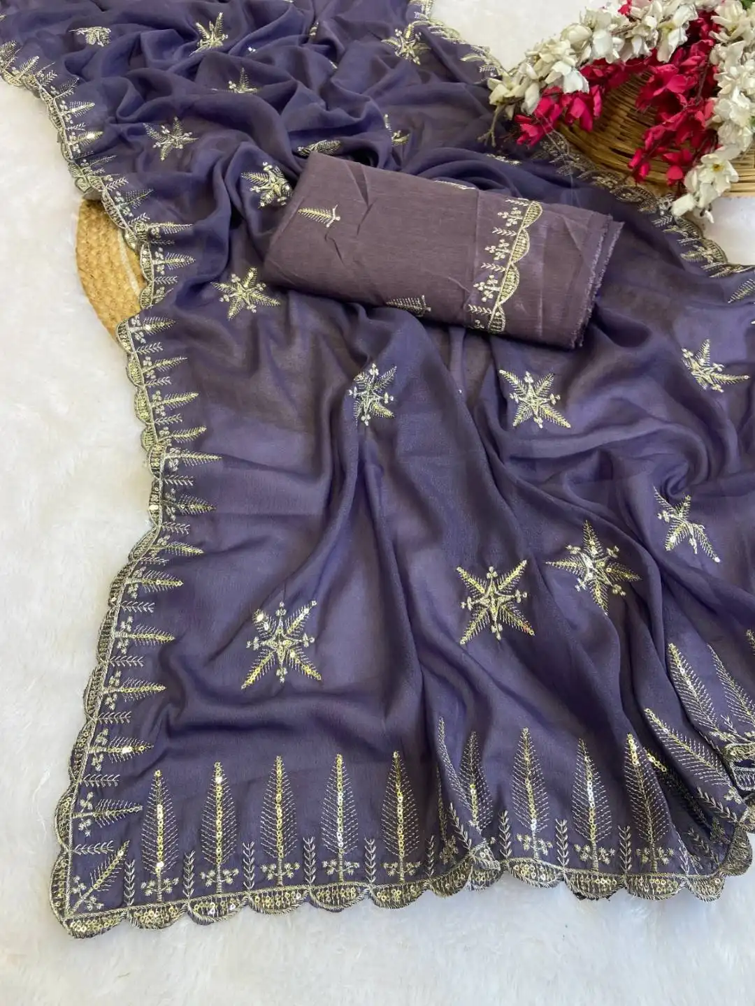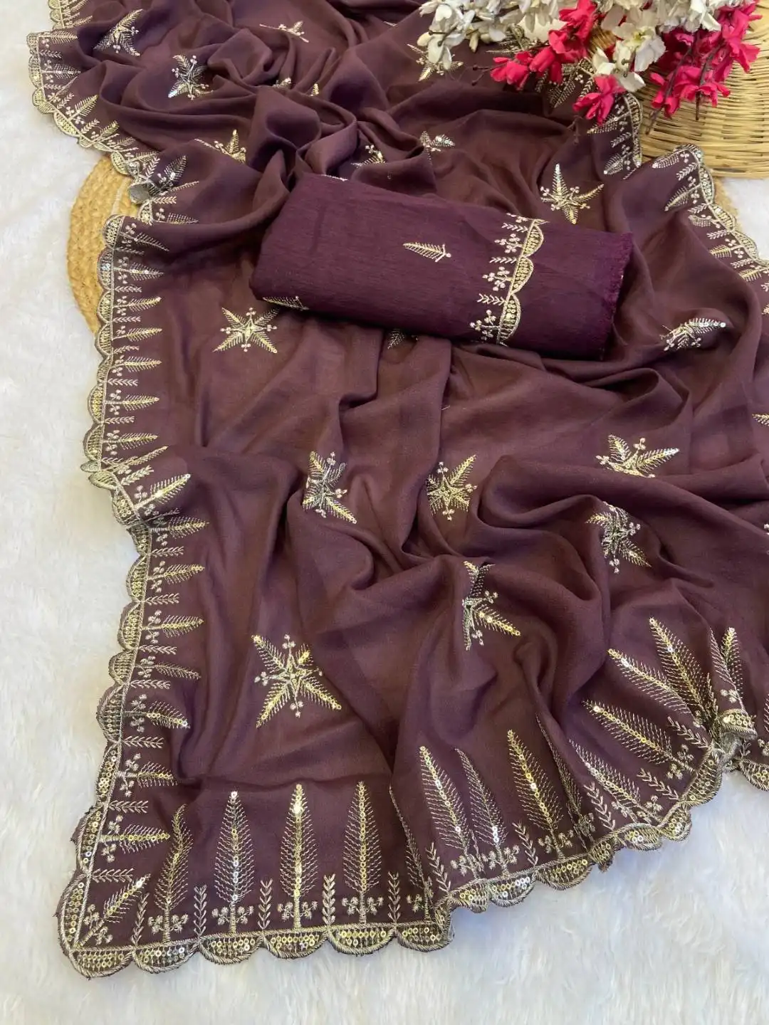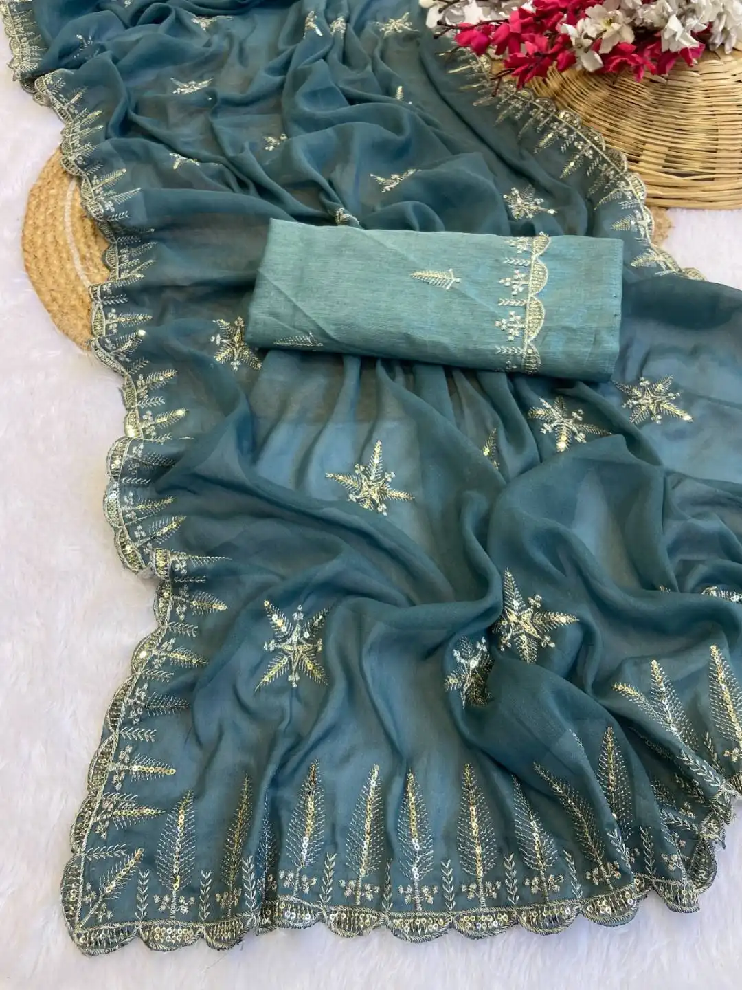 Saree: | STAR GEORGETTE BEAUTIFUL RICH & HEAVY MULTI SEQUENCE DESIGN BORDER WITH C-PALLU AND SEQUENCE BUTTI IN ALL OVER SAREE | CUT – 5.5 m |
