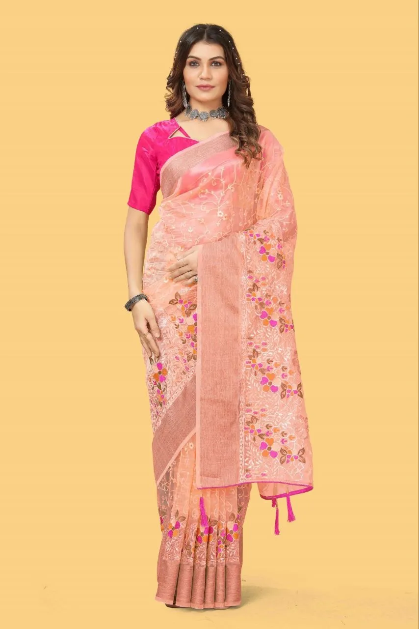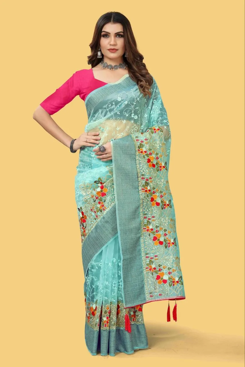 | Saree | Organza Silk, Work- Beautiful Mullty Color Thread and zari-dori work with Stone work and Zari weaving Patta on Border and Tassel work on Pallu, Border, Craft- Embroidery, Purity- Pure |