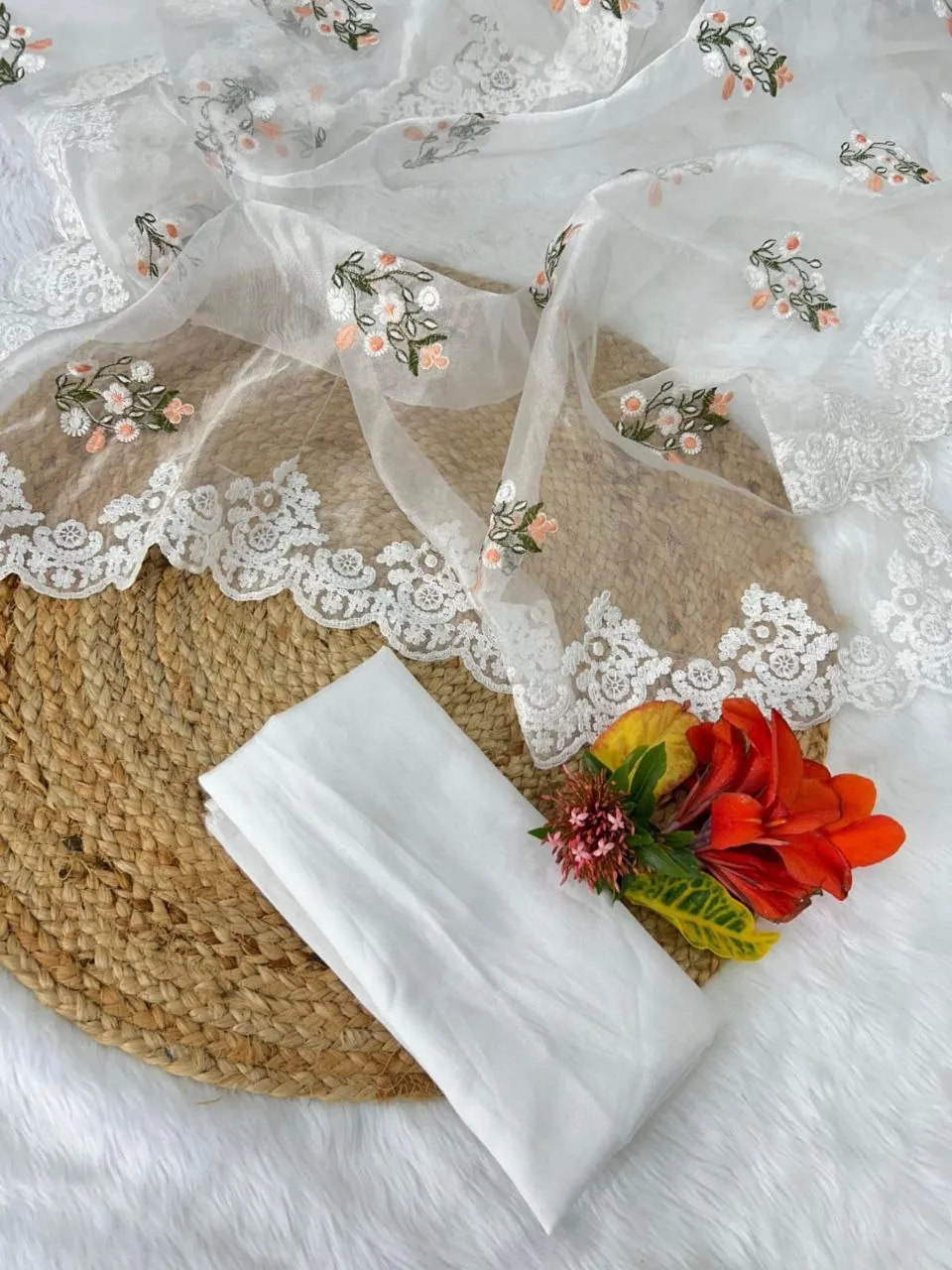 | Saree | Organza Silk, Work- Beautiful Floral Embroidered work of Mallty Thread and Designer Border with Cutwork, Craft- Embroidery, Purity- Pure |