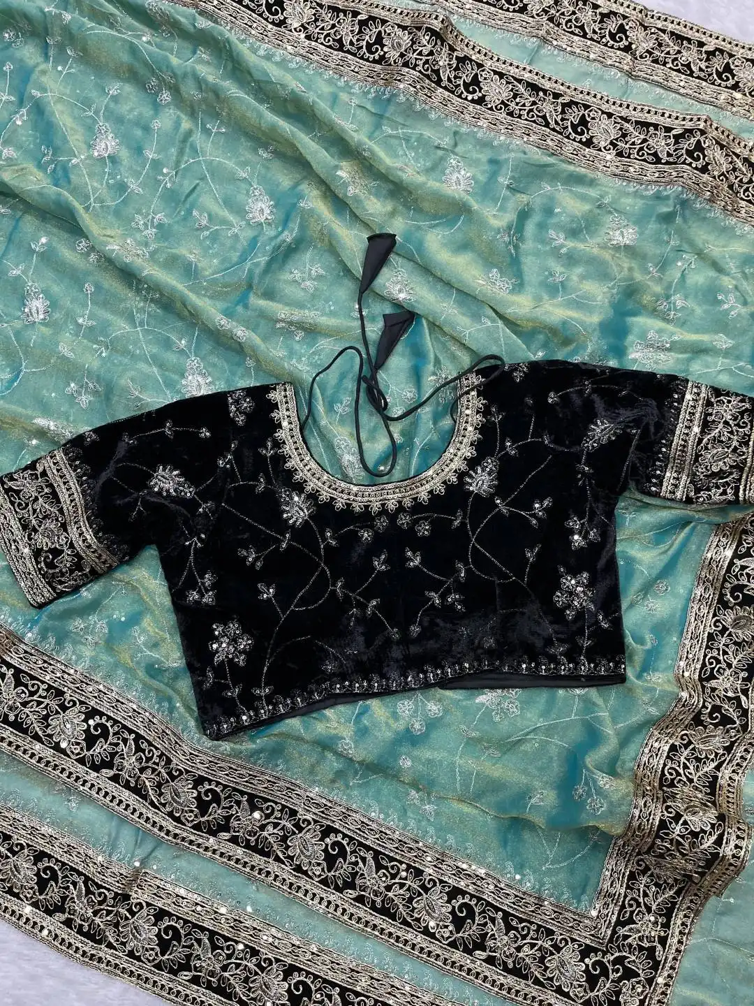 | Blouse: | 9000 Velvet Work: Designer Embroidery work of Silver jari and Sequins. Pattern: Unstitch Blouse with Embroidered Sleeves. |