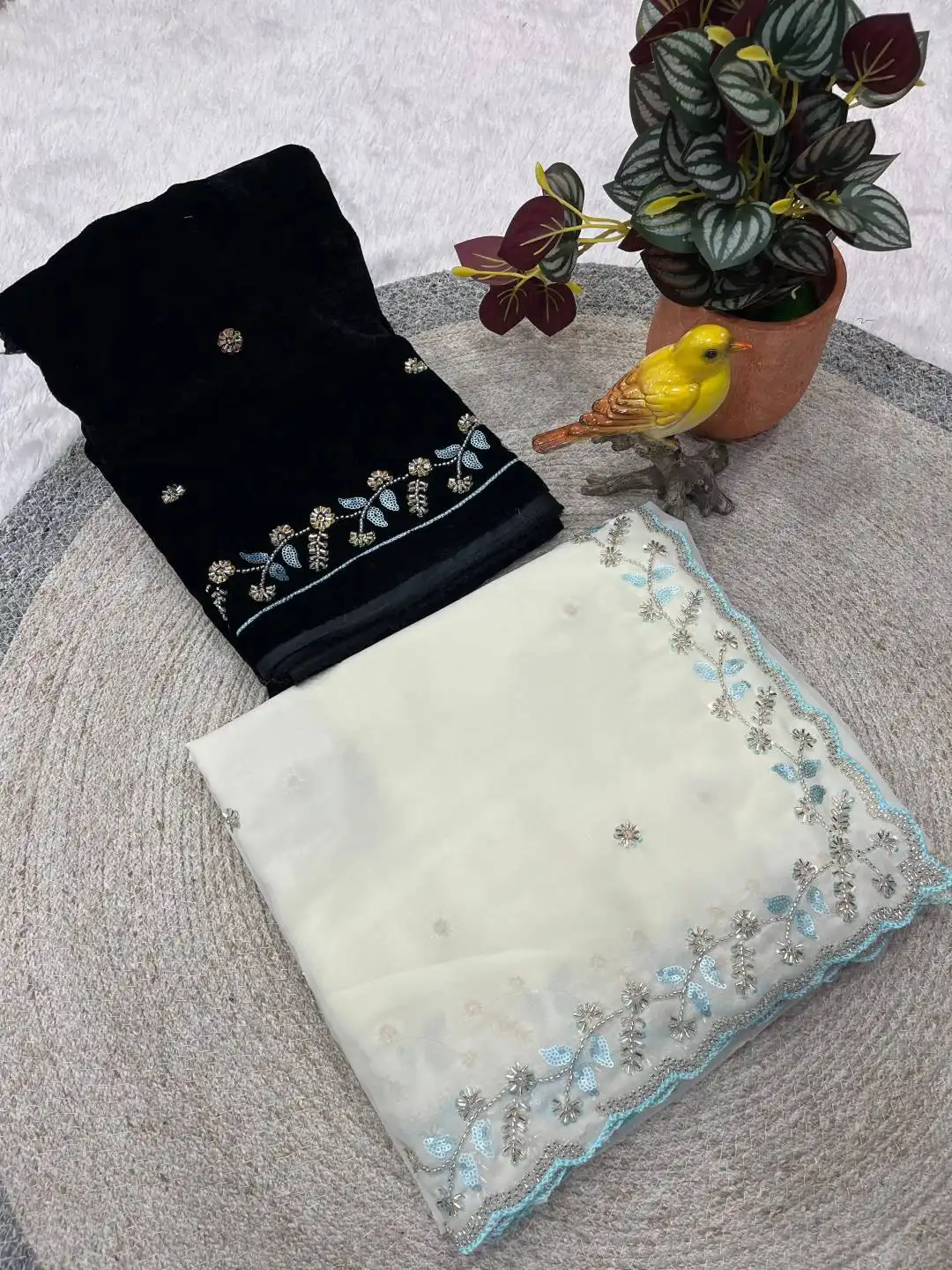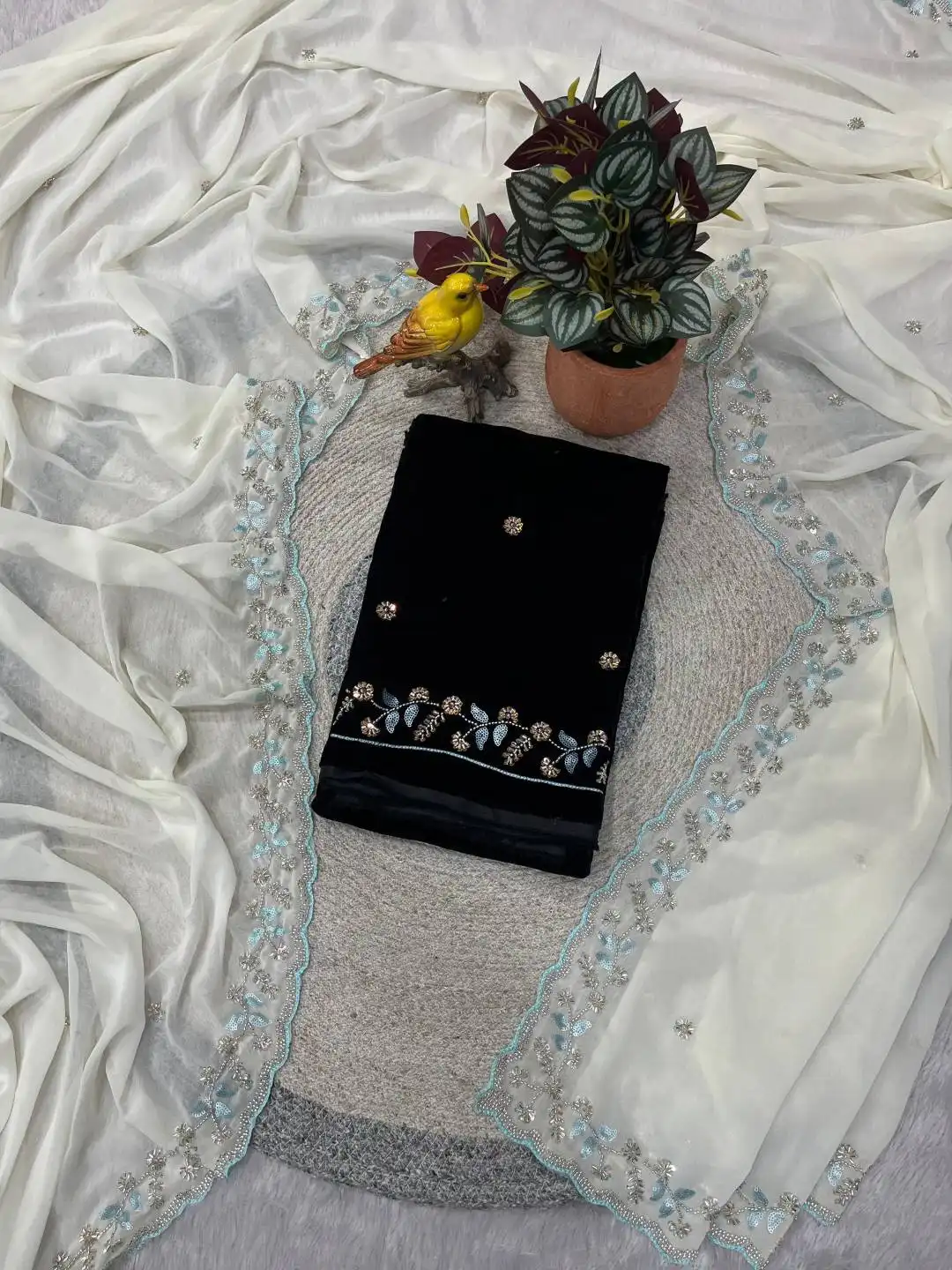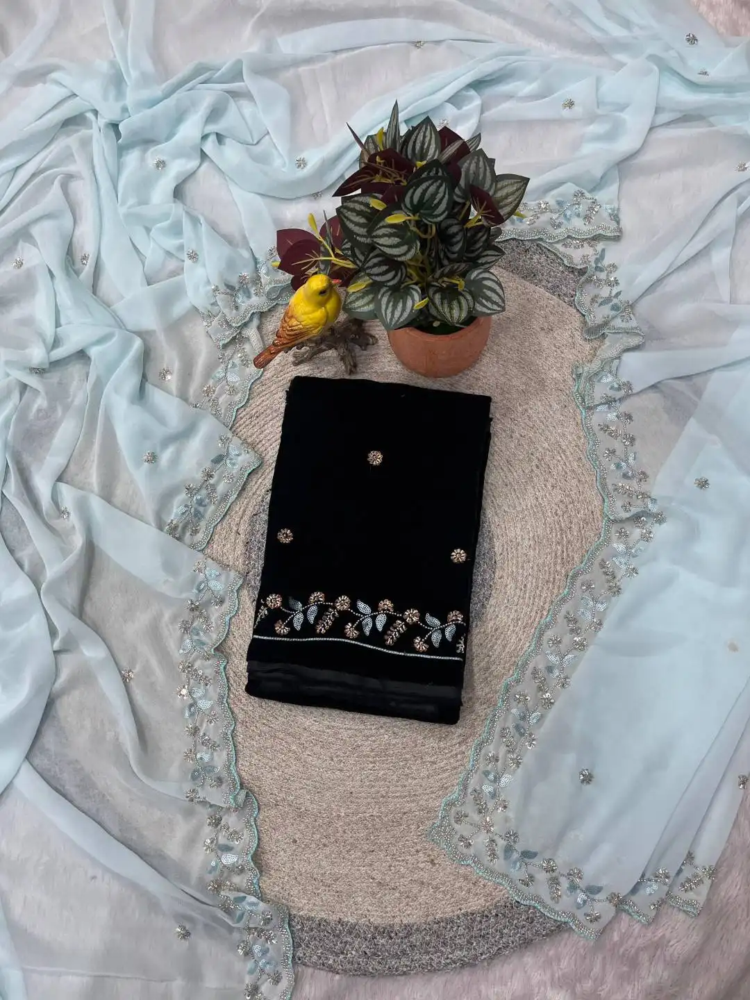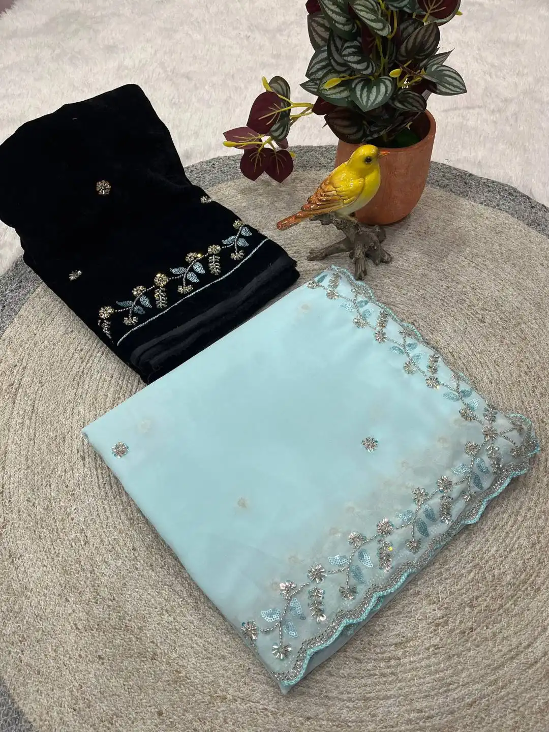 | Blouse: | 9000 Velvet Work : Floral Embellishment Work of Beads and Sequins with Malti Thread Work on Border. Pattern : Unstitched (0.80 Meter) |