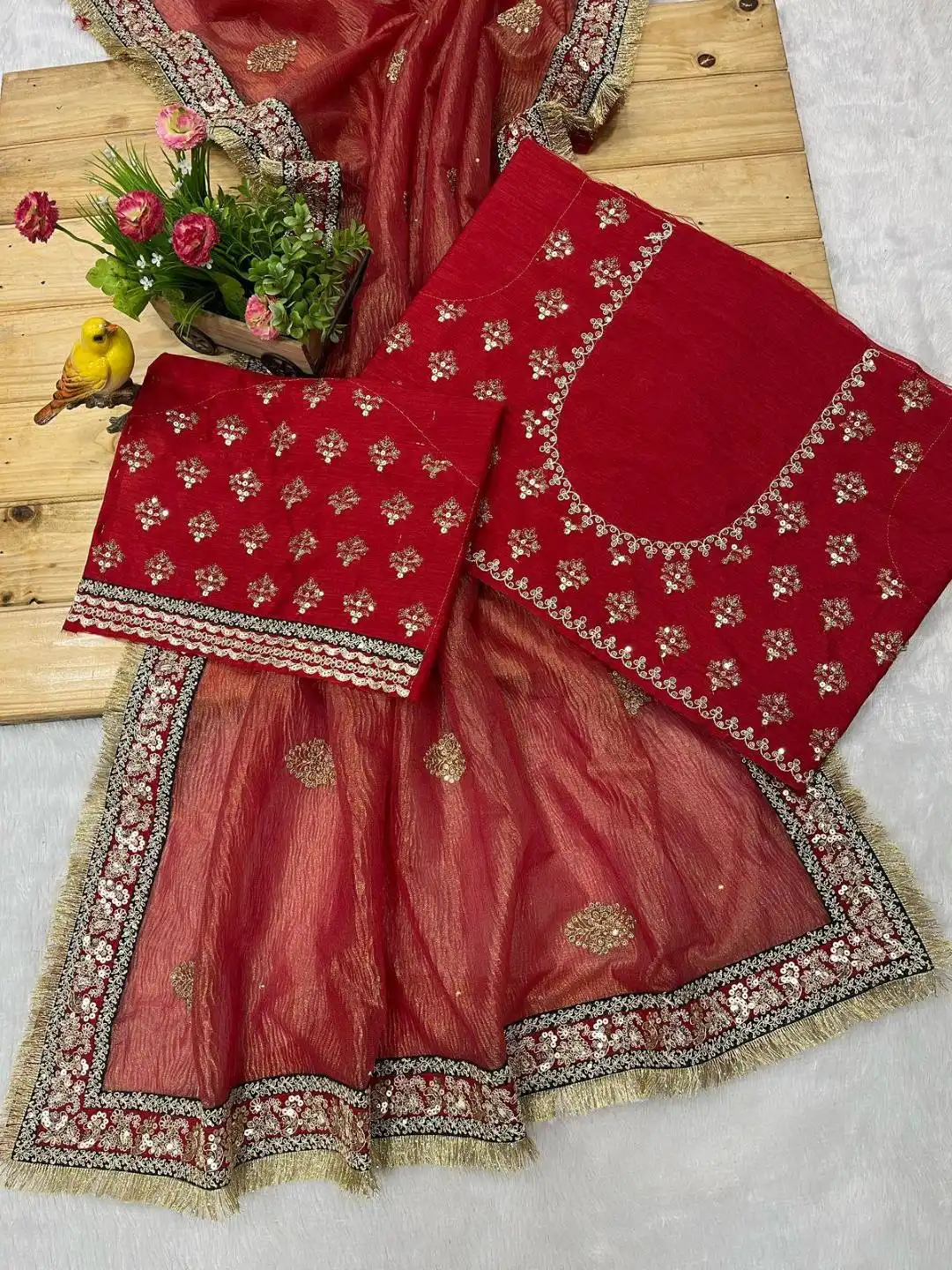 | Blouse: | Mono Diamond Silk Work: Beautiful 3mm & 5mm Sequins with Jaro dori Work Blouse and Sleeves. Pattern: Fully Unstitched Blouse with Front, Back & Sleeves. |