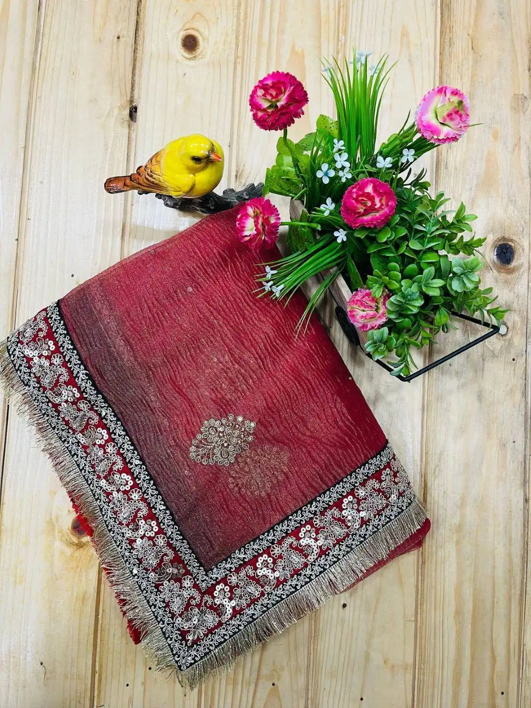 | Saree: | Banarasi Crush Work : Beautiful Embroidered Butta of Jari Thread & 3mm Sequins with Diamond in Body & 3mm & 5mm Sequins with jari dori Embroidery Work & Fancy Lace on The Border . Craft : Embroidery Purity : Pure |