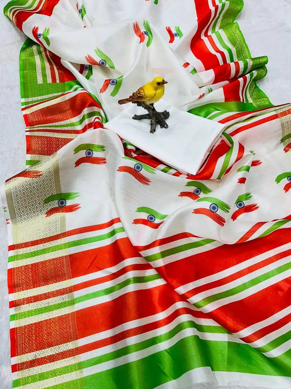 | Saree: | Banarasi Silk Work: Beautiful Designer Tiranga 🇮🇳 Printed Festive Design with Jari Weaving Border. Craft : Weaving with Print Purity : Pure |