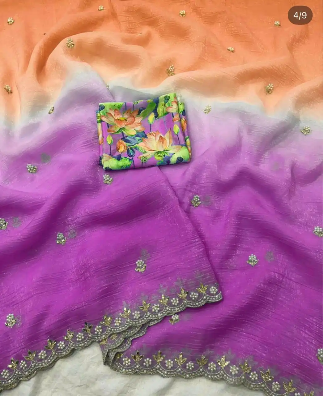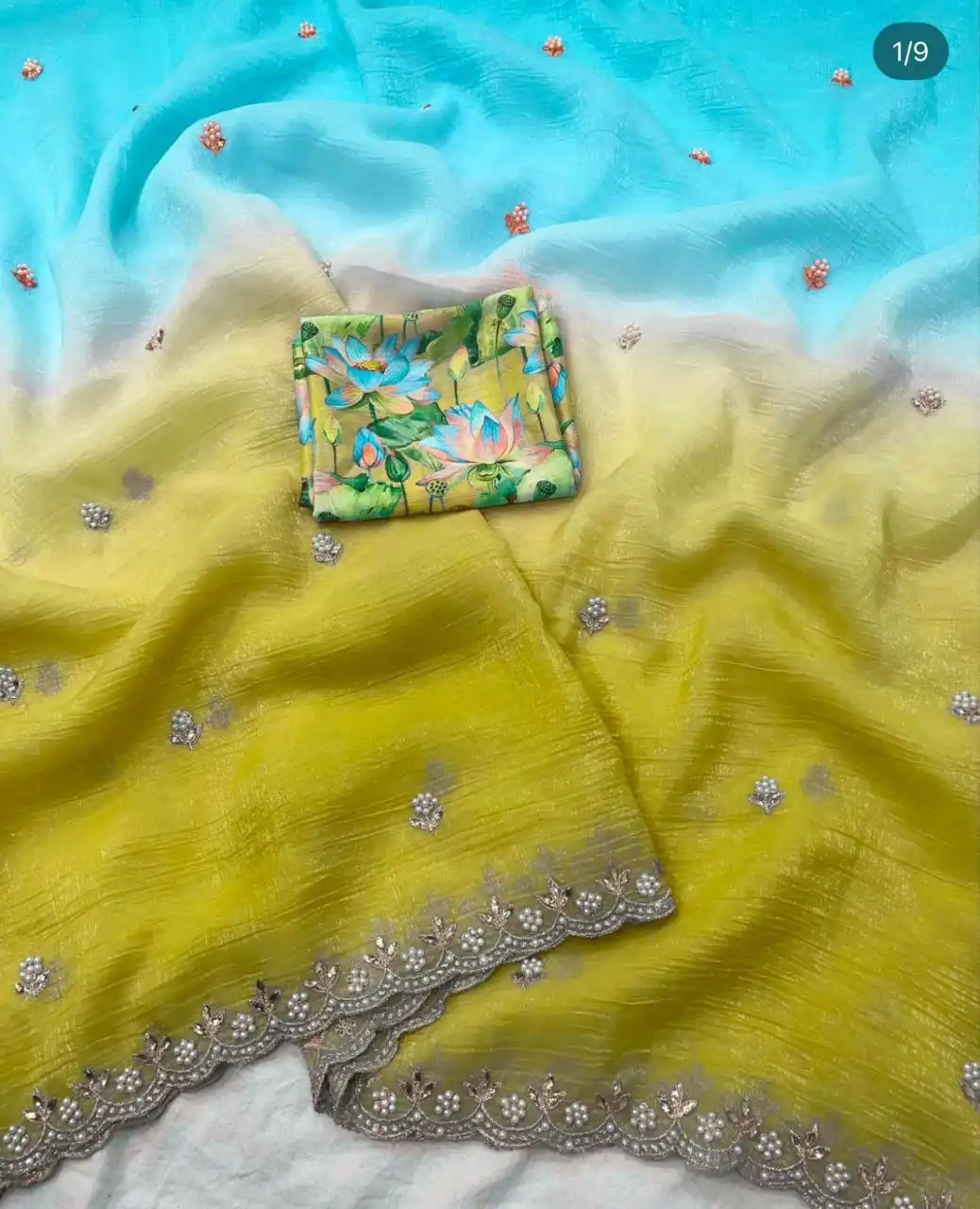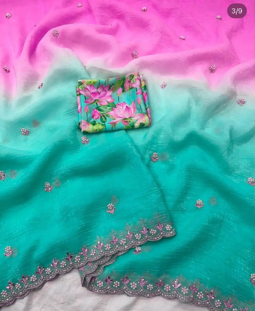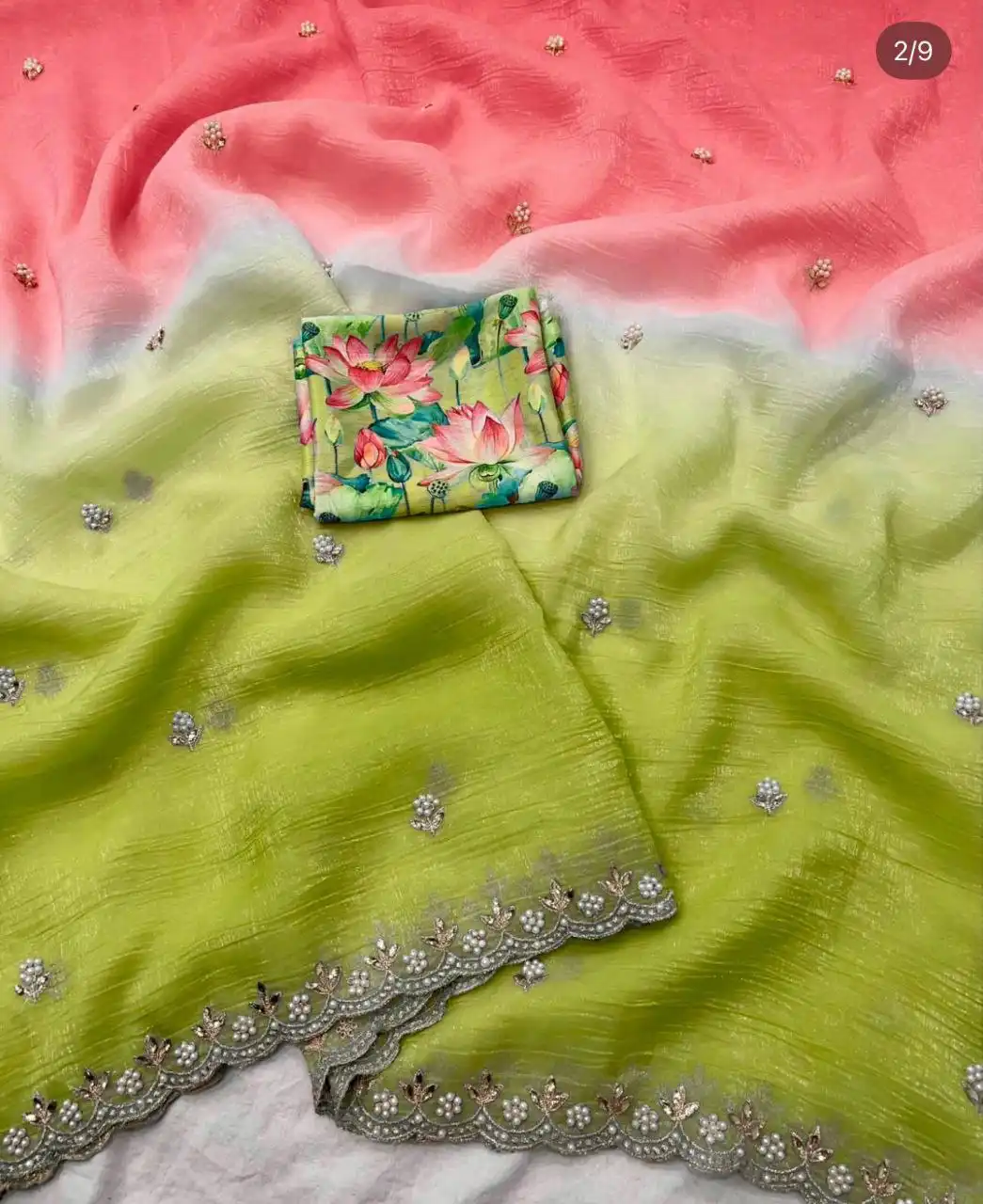 | Saree: | Candy Crush Silk With Beautiful Embroidery& Moti Work Scalloped Cut work Border | Cut:- 5.5Mt |