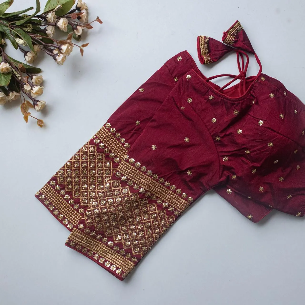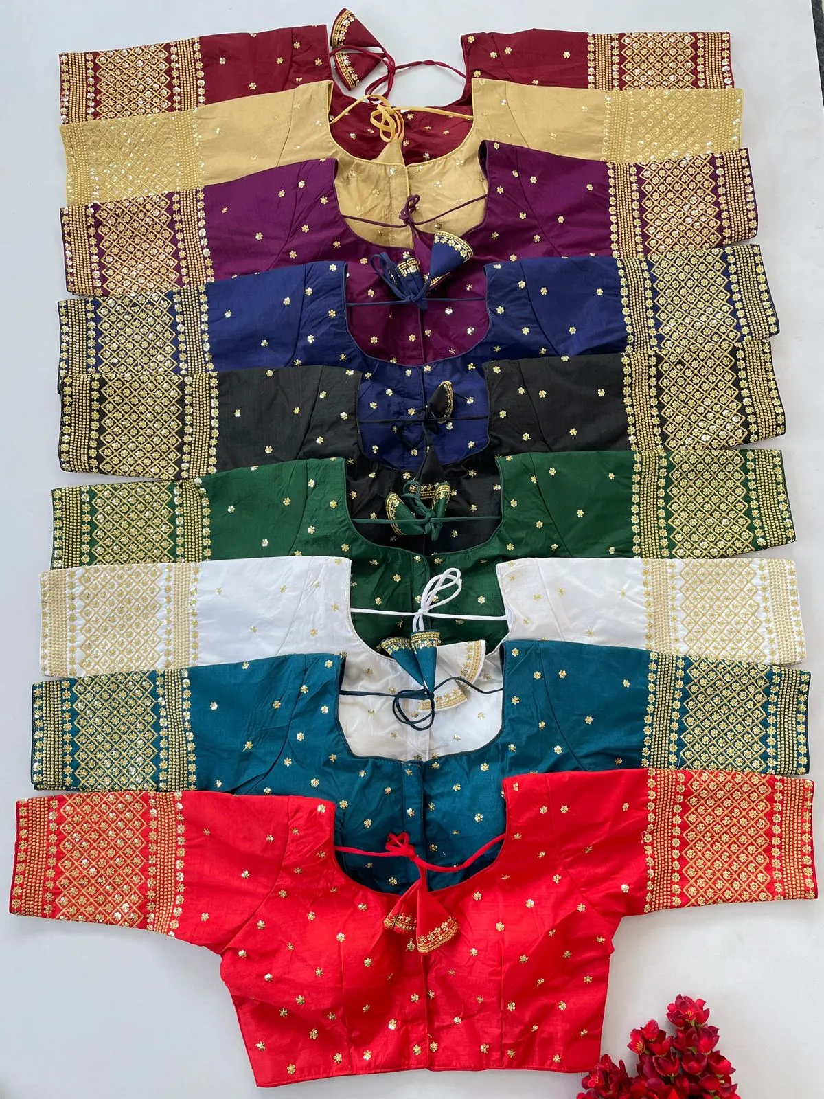 Blouse Vichitra Silk, Work- Embroidery zari n Sequence, Lining- Cotton, Pattern- V Neck, Open- Front With Hook n Back Heavy Latkan, Sleeve- 3/4, Pad- Yes, Size- 38 upto 42 Chest