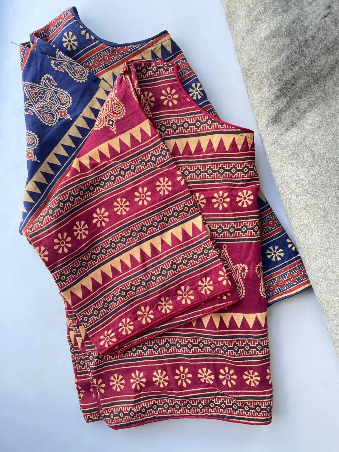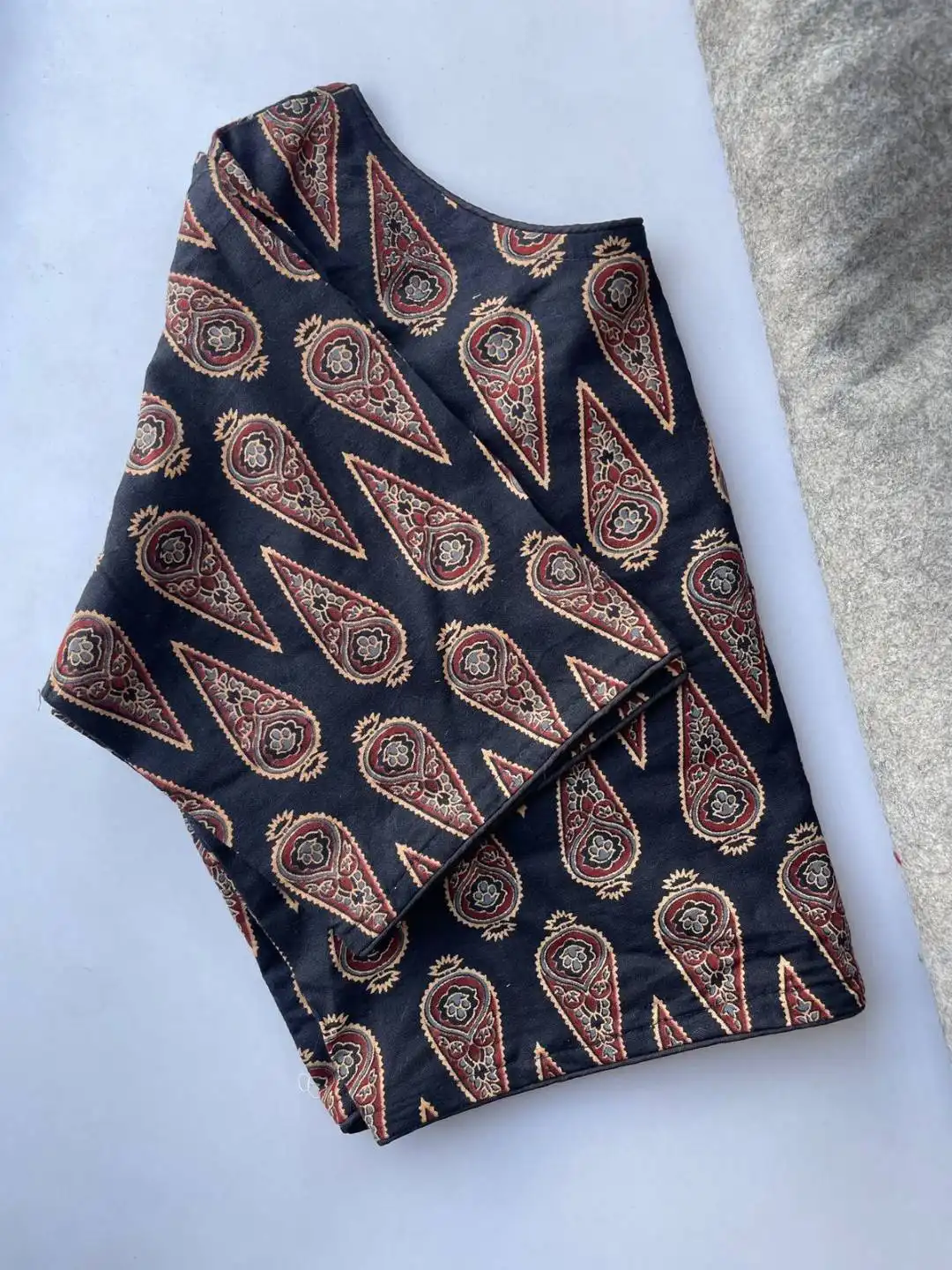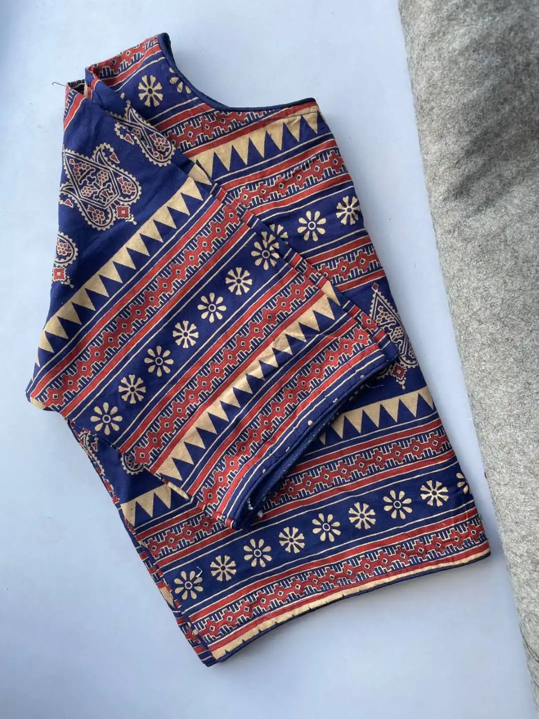 | Blouse: | South HandBlock Cotton | Height 15 | Pattern Boatneck Kum Round Neck in Princess Cut | Sleeve Elbow 10 inch | Open Front Hook | Pad No | Astar No |