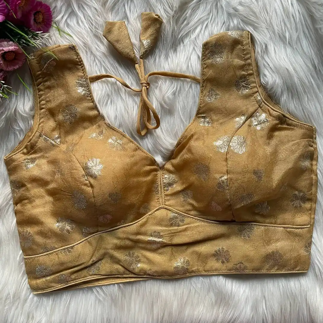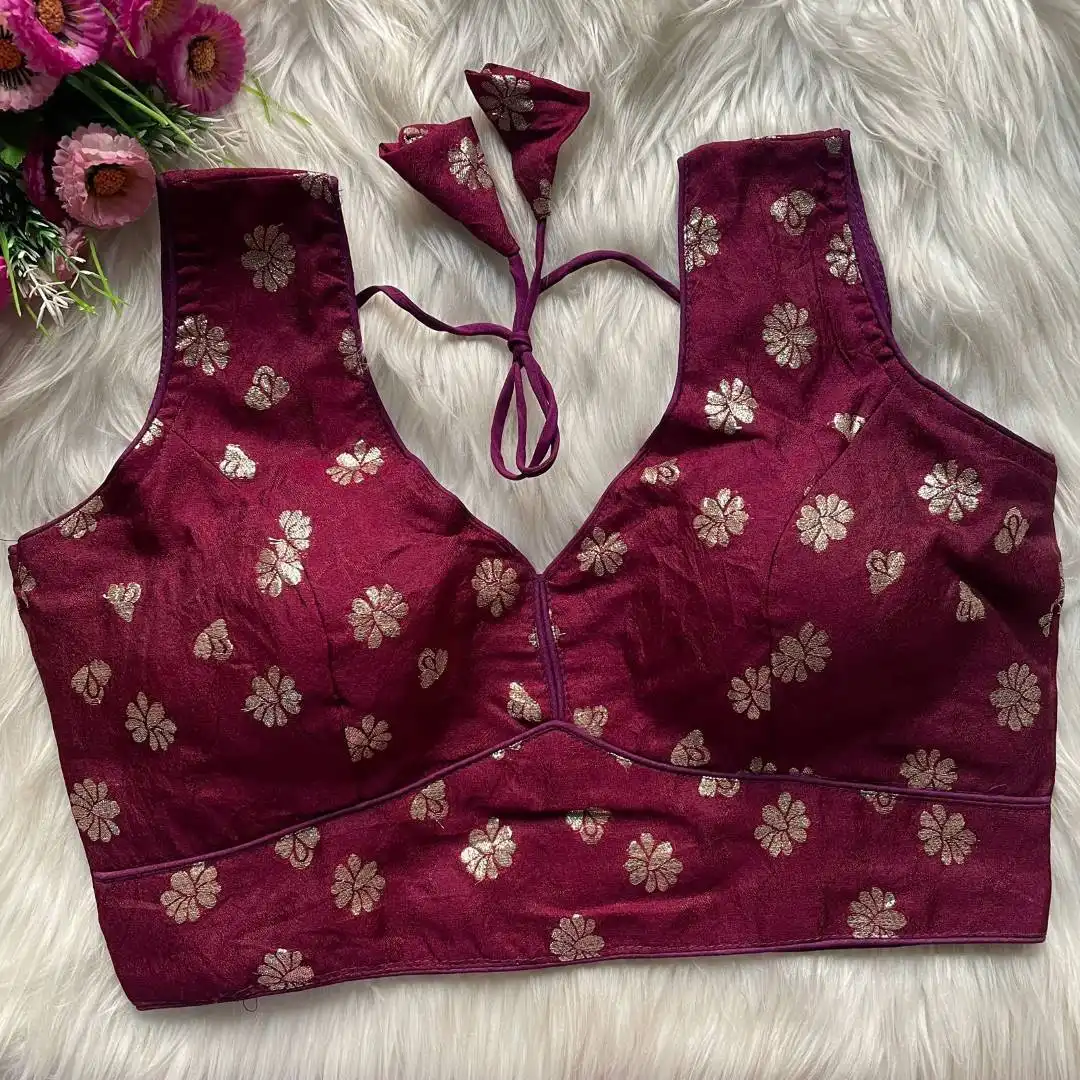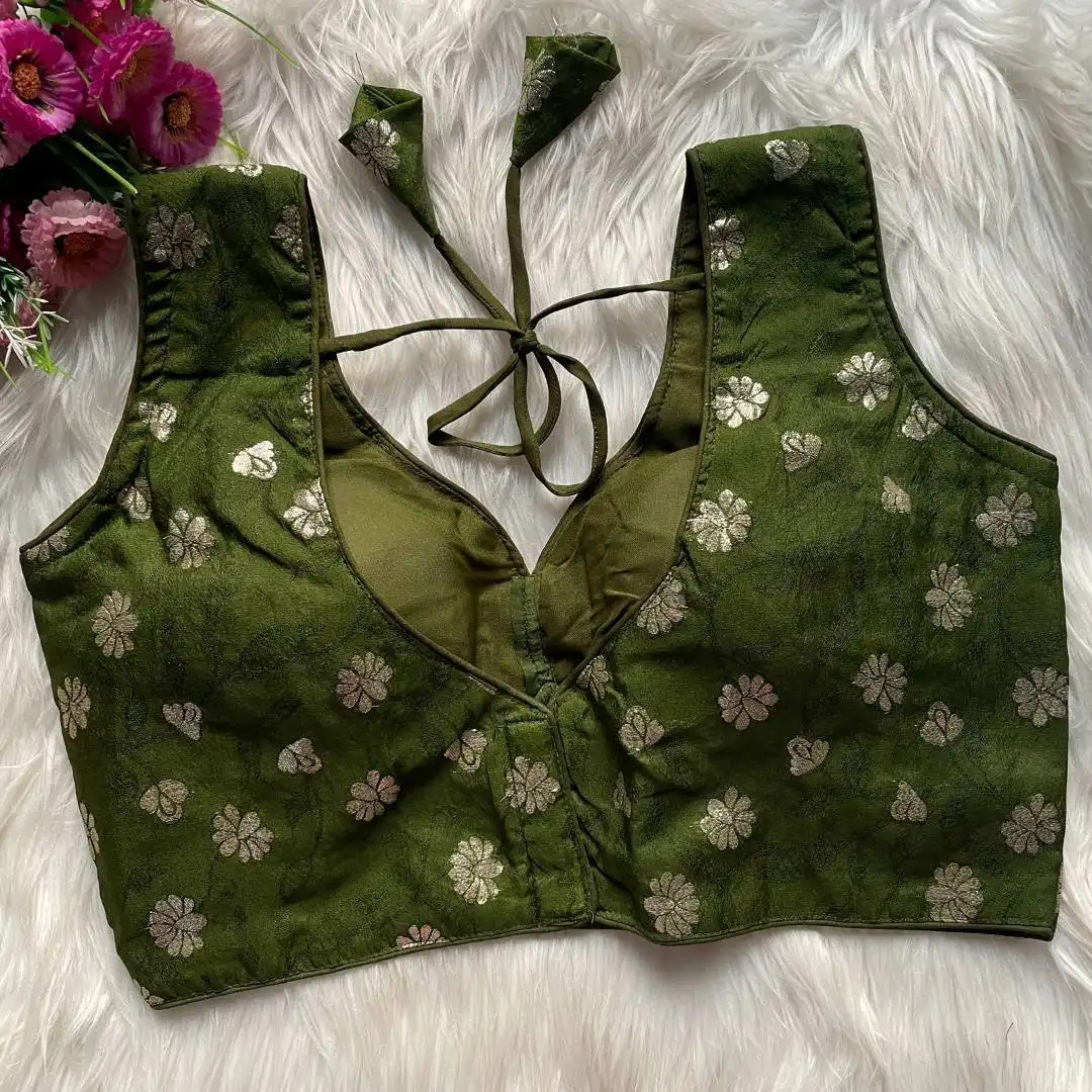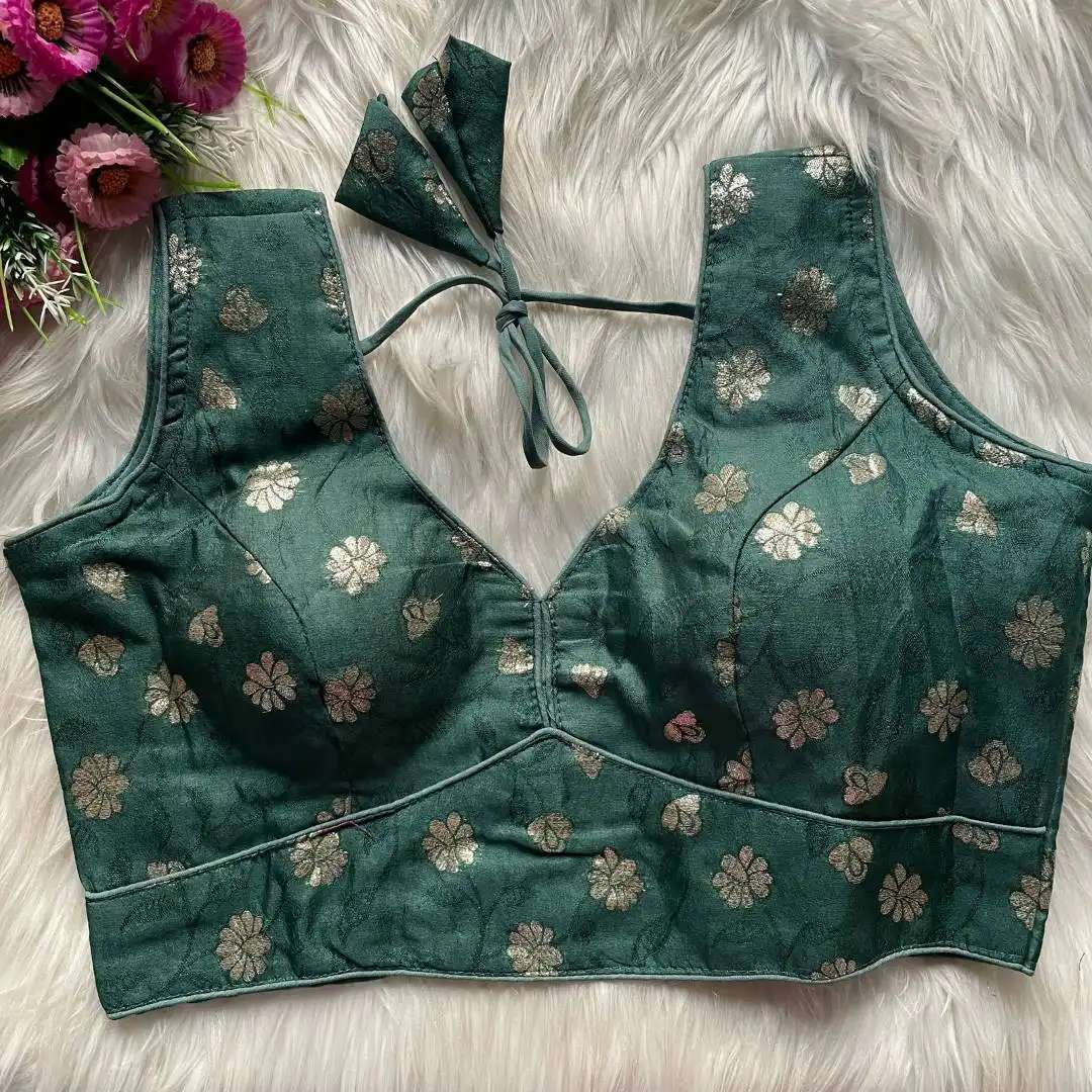 | Blouse: | DOLA SILK JEQUARD | INNER LININGS:- Pure Indo Cotton Astar | SLEEVES:- 10 Sleeve In Side Attached | DESGINE:- Beautiful Partywear Blouse Heavy Stitching Heavy Padded Back open Style |
